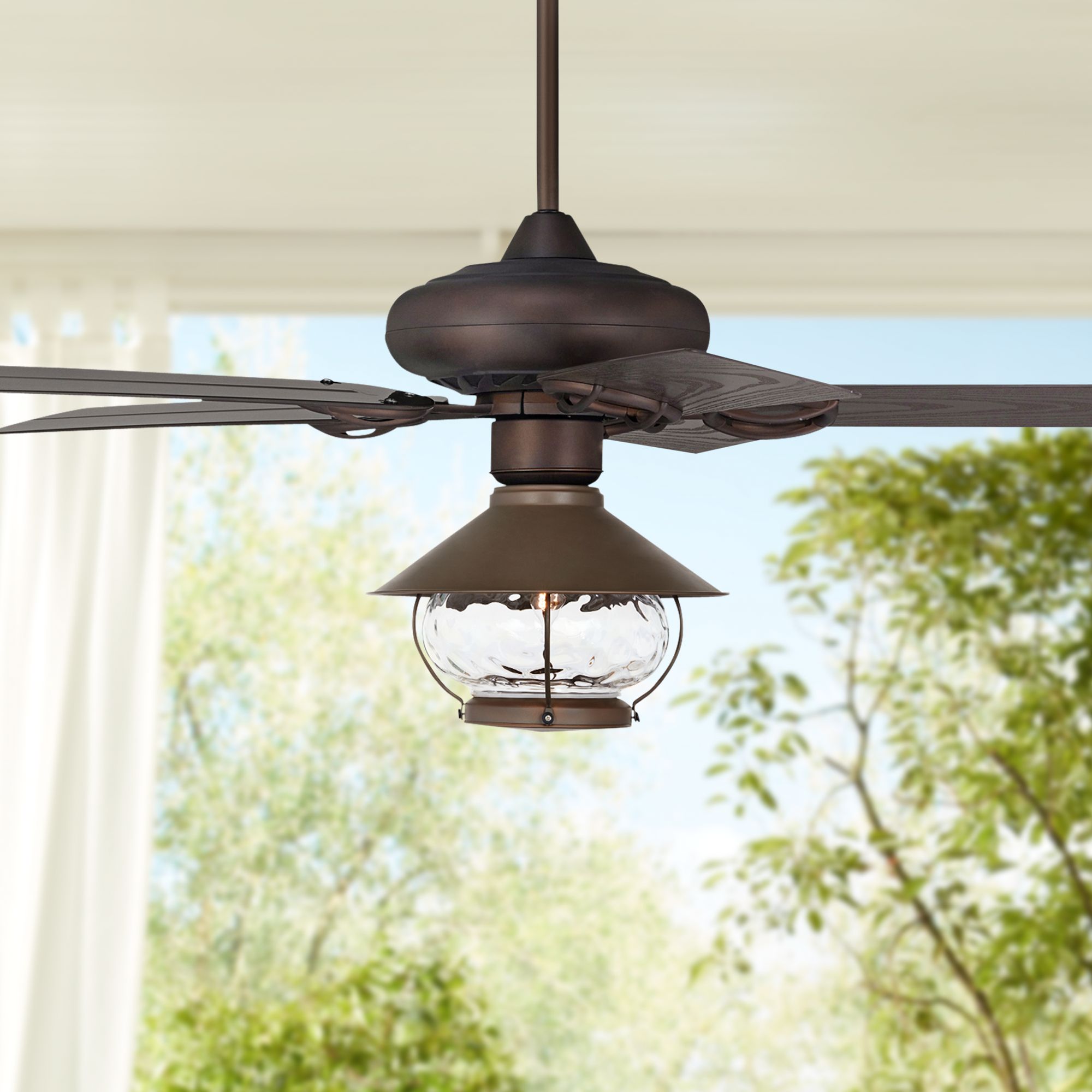 The Defender™ outdoor ceiling fan from Possini Euro Design® is rated for use in damp locations. It comes in a handsome oil-rubbed bronze finish motor and eight koa finish ABS blades with a 60-inch blade span. An energy-efficient LED light module includes a polycarbonate lens. A handheld remote control is included for operation.