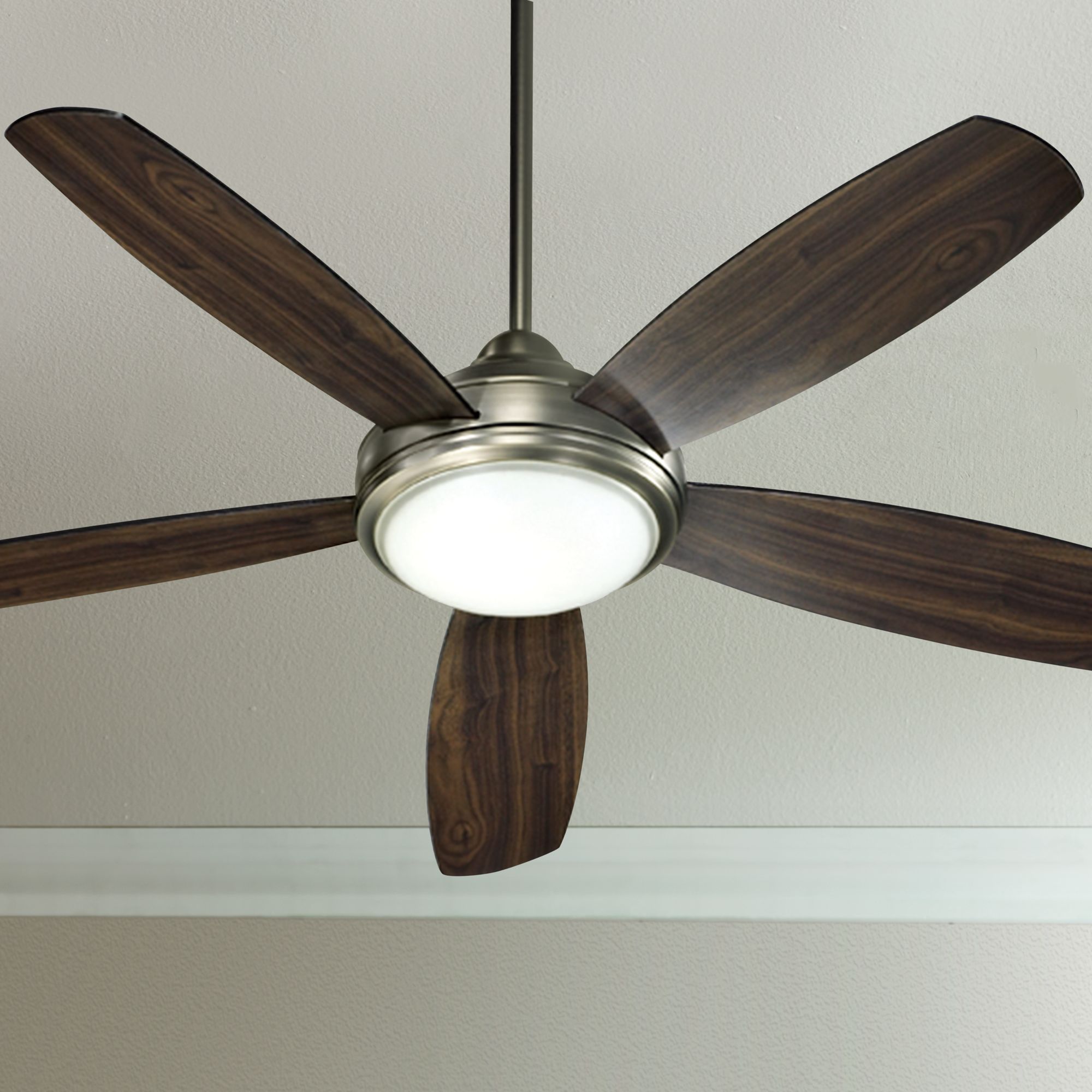 The Irene Hugger ceiling fan from Matthews offers strikingly modern form and style. This brushed nickel finish fan design comes with five walnut-stained machine-cut solid wood blades. Includes a 6-speed hand held remote and wall control and is UL listed for damp locations. (IMAP)