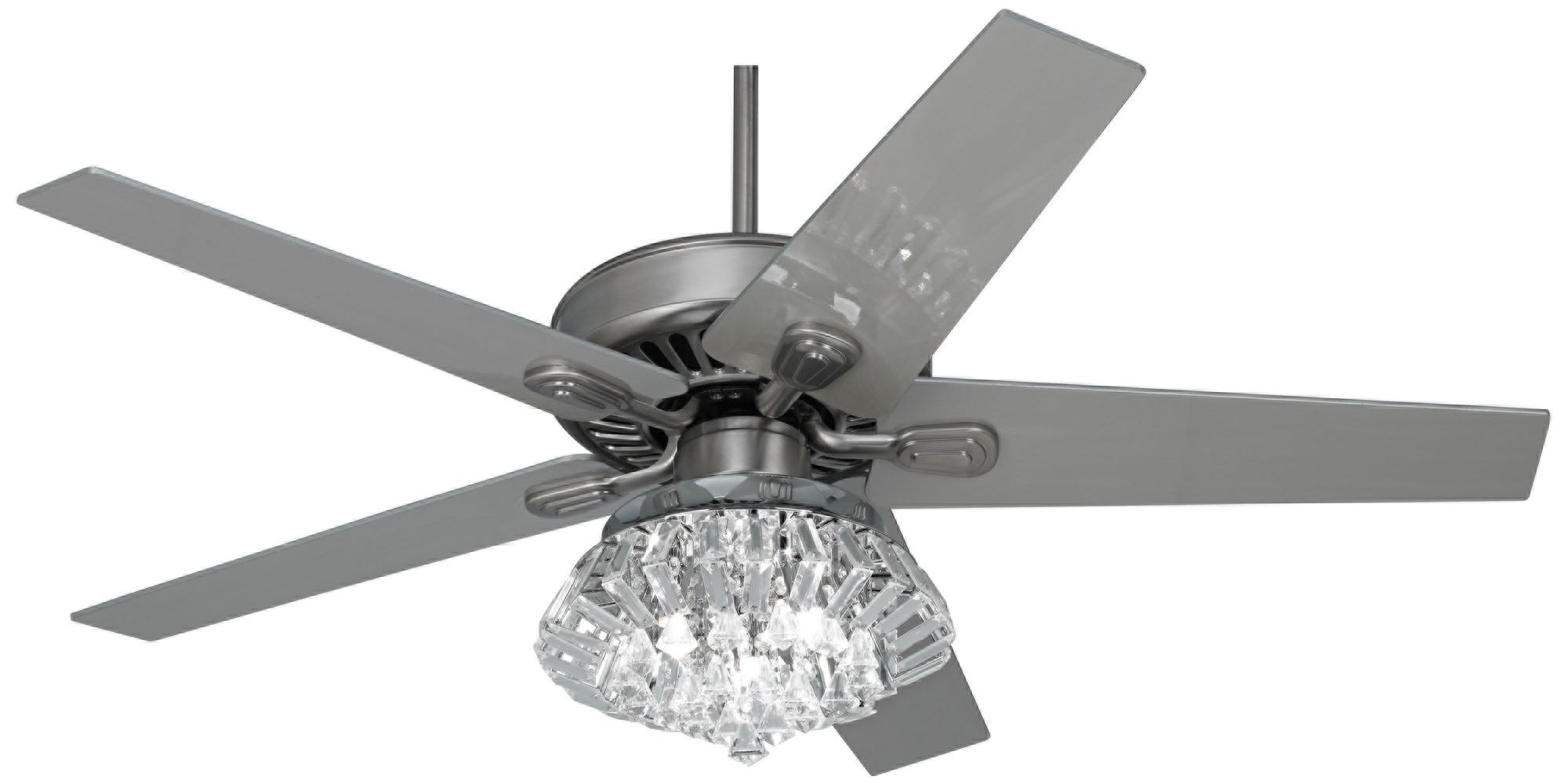 Refresh your space with this contemporary ceiling fan from the Windstar II™ collection by the Casa Vieja® brand. It comes in a classy brushed nickel finish motor, with five silver finish blades that add a modern complement. At the bottom is a crystal light kit that recalls vintage Art Deco styles. Two energy-efficient LED bulbs are included for use with the light kit. From the Casa Vieja collection of chandelier style ceiling fans.