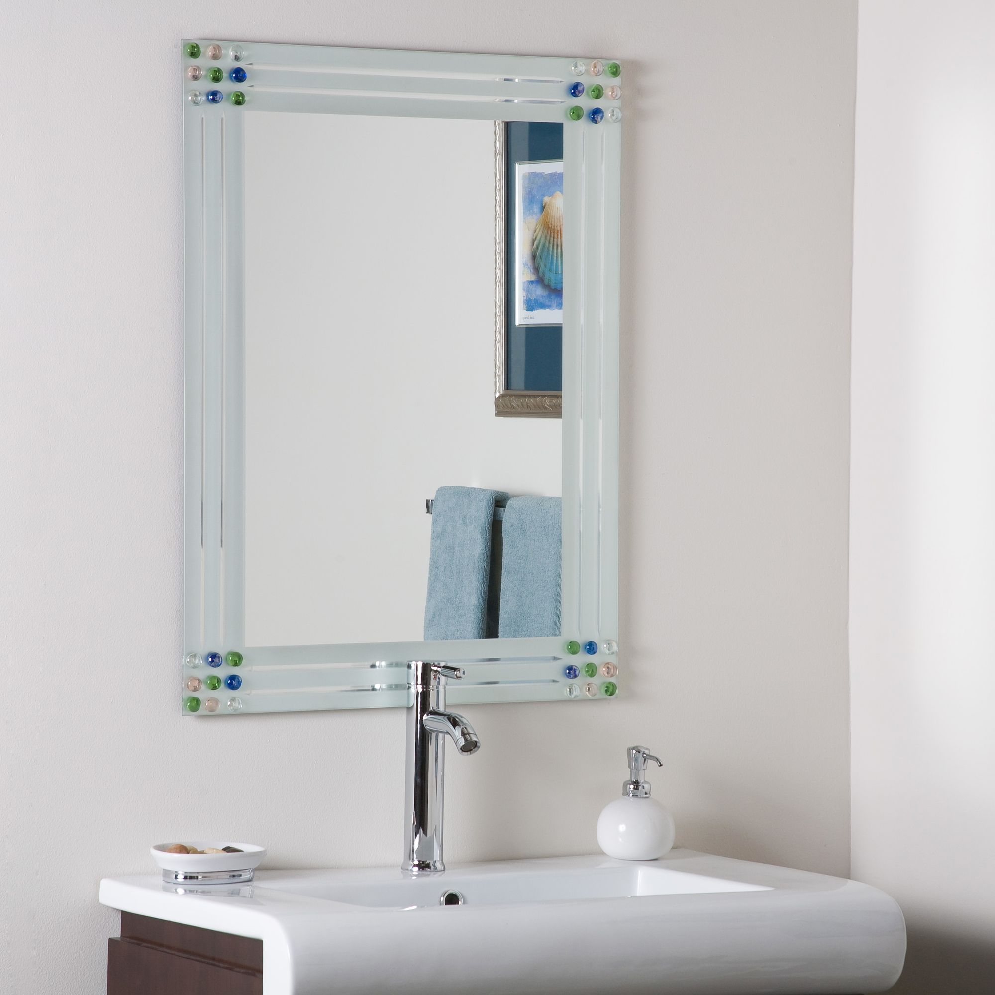 Simple sophistication with a geometric flavor spices up the motif of this rectangular frameless bathroom wall mirror. Reflect on tasteful style with a mirror crafted from two layers of thick float glass and trimmed with a fashionable V-grooved design around the edges. Beveled glass offers a deeper dimensional quality. Distortion-free reflection represents the new function of contemporary mirrors.