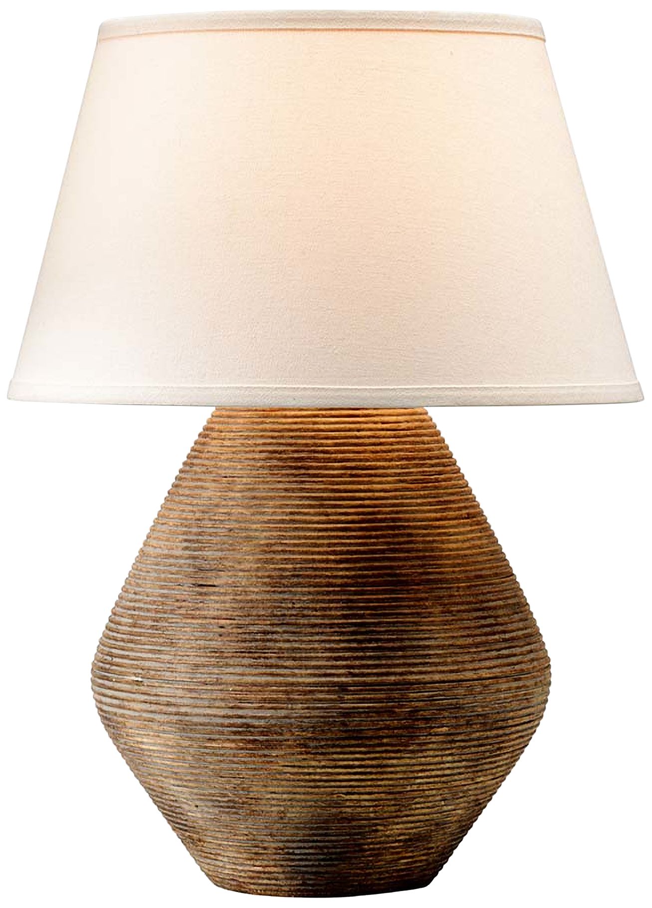 - Brown finish. Cast resin construction. Kraft paper tapered shade with pine tree stencil pattern.