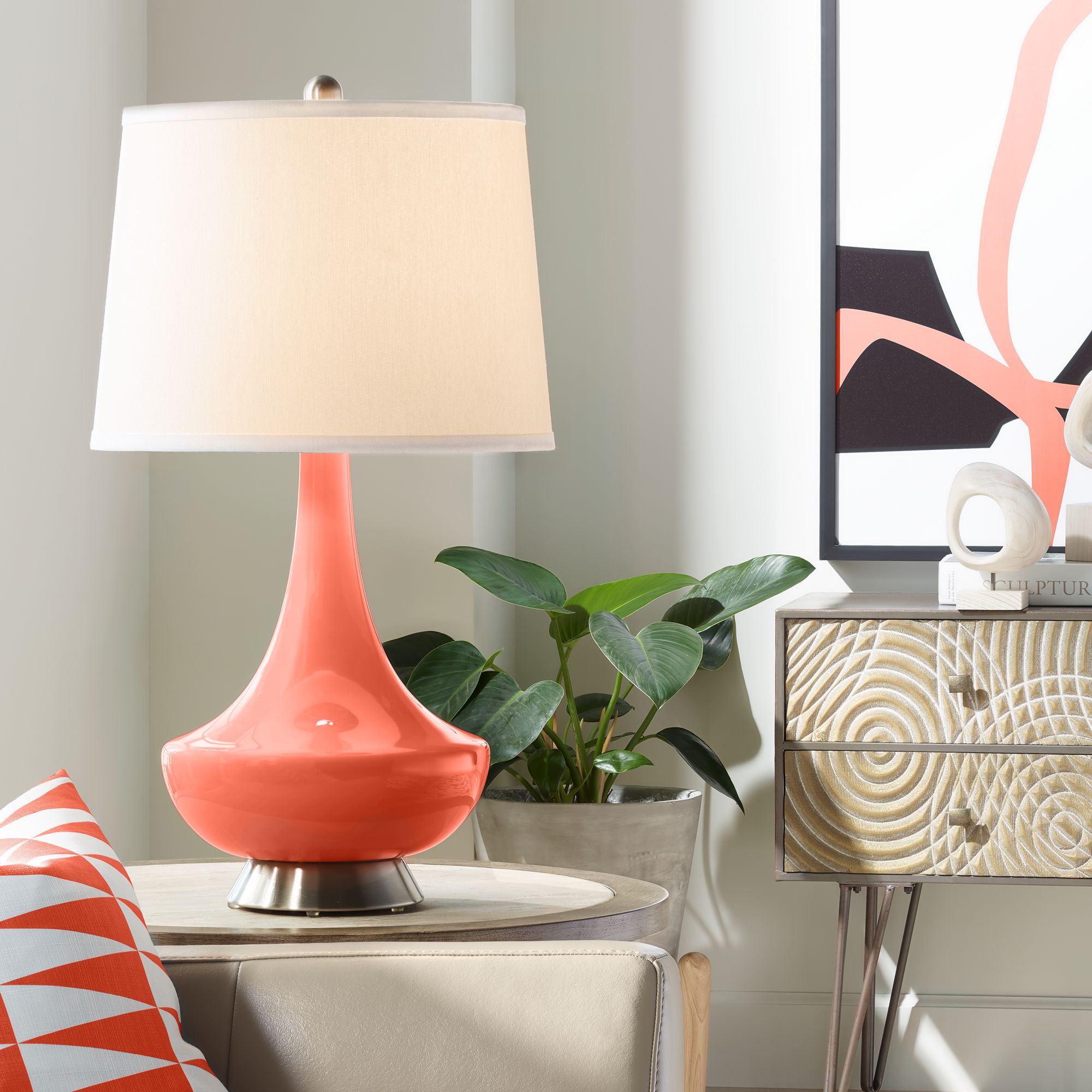 This apothecary style Color + Plus™ glass table lamp will infuse your decor with brilliant color and style. This beautiful Daring coral orange designer lamp is hand-crafted by experienced artisans in our California workshops. It stands on a lucite base, and is topped with a stylish white linen shade. A great look for color of the year! Lamp base U.S. Patent # 8,899,798