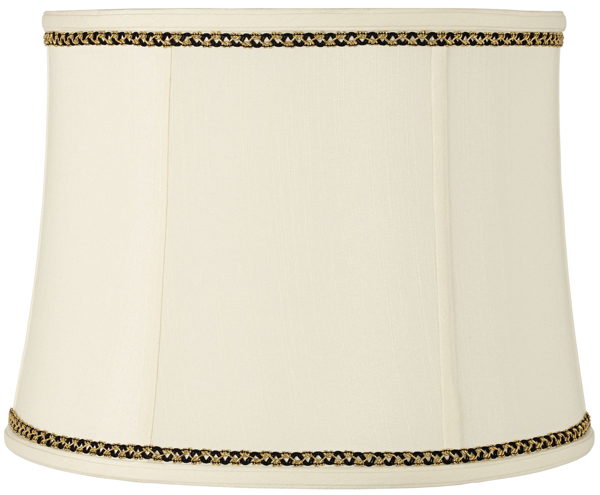 Crisp and cosmopolitan lamp shade in a handsome creme fabric. Accented with an artisan hand-applied yellow gold ribbon scroll shade trim along the bottom. Slight bell shape has a more formal look about it.