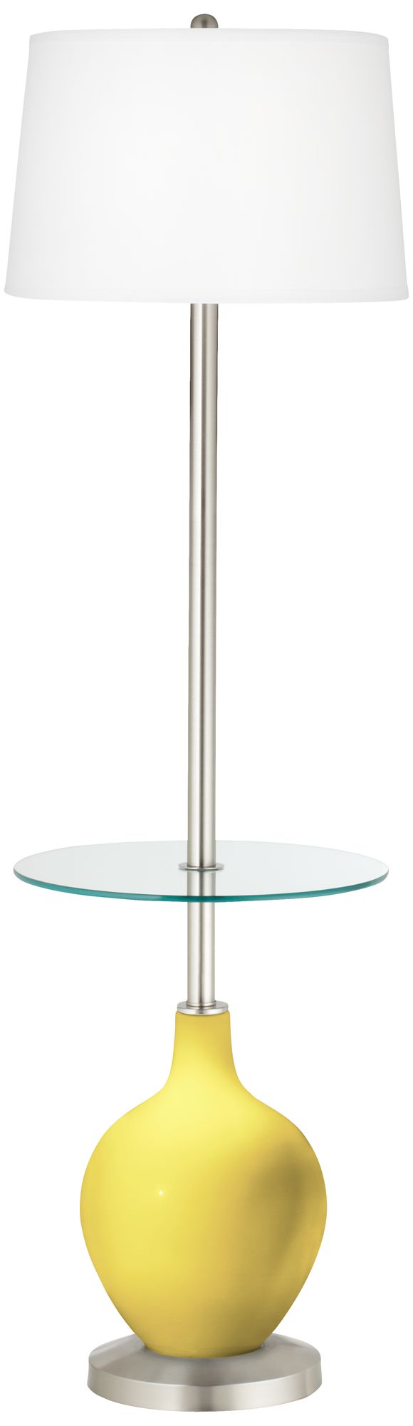 Add designer style to your home with this tray table floor lamp design from the Color + Plus™ collection. The clear glass tray table offers a handy spot to place a TV remote or your favorite beverage. Below the tray, the lamp base stands beautifully in our designer Lemon Twist yellow color. A white fabric shade completes the look up top. Custom made to order lamp design. Lamp base U.S. Patent # 8,899,798