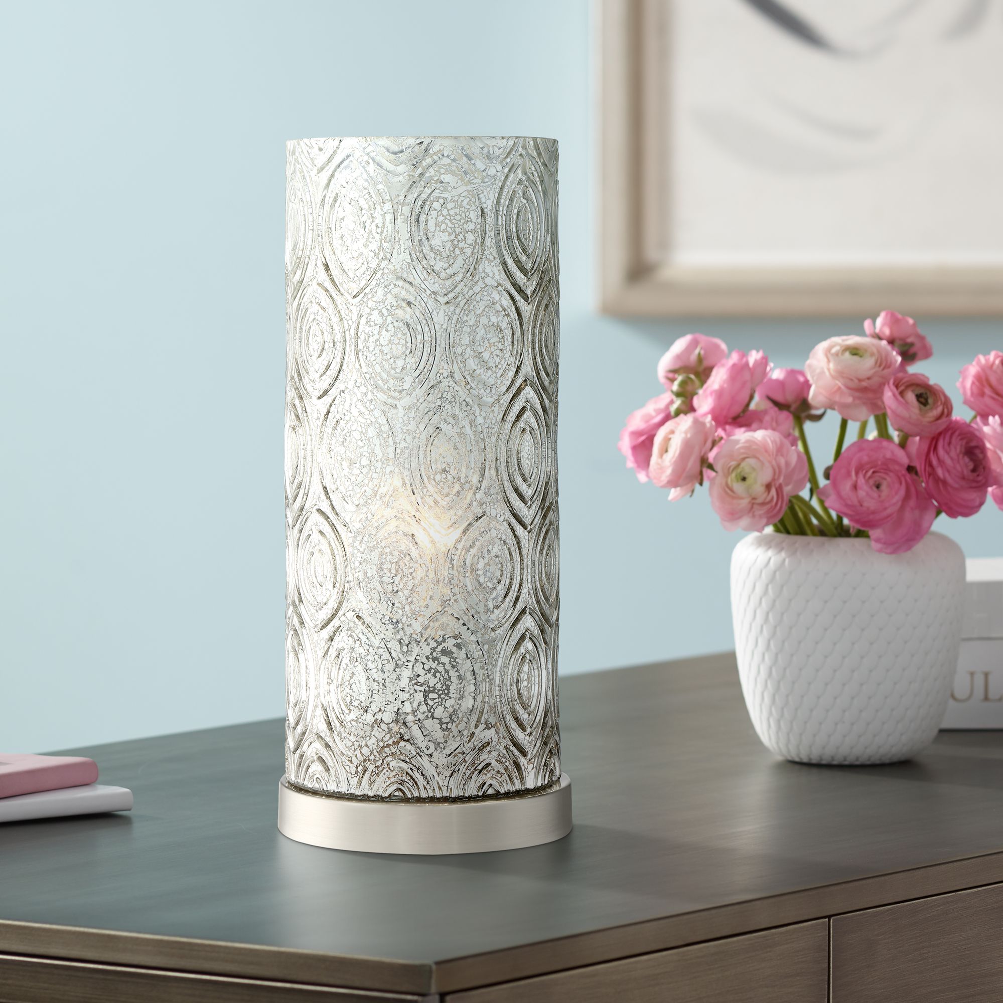 - Brushed nickel finish, metal construction. White drum lamp shade.