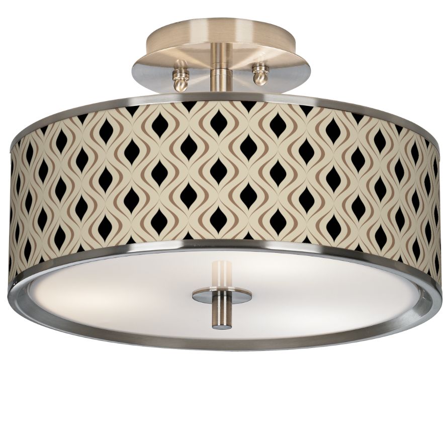 Define your style in any room with this sophisticated semi-flushmount ceiling fixture. The design features an exclusive pattern custom giclee printed on a translucent shade. This high-quality material allows warm light to shine through the shade, illuminating the pattern and creating a spectacular look. A white acrylic diffuser at the bottom prevents glare and provides even lighting. Energy efficient design includes CFL bulbs. This stylish ceiling light fixture is custom made to order. U.S. Patent # 7,347,593.