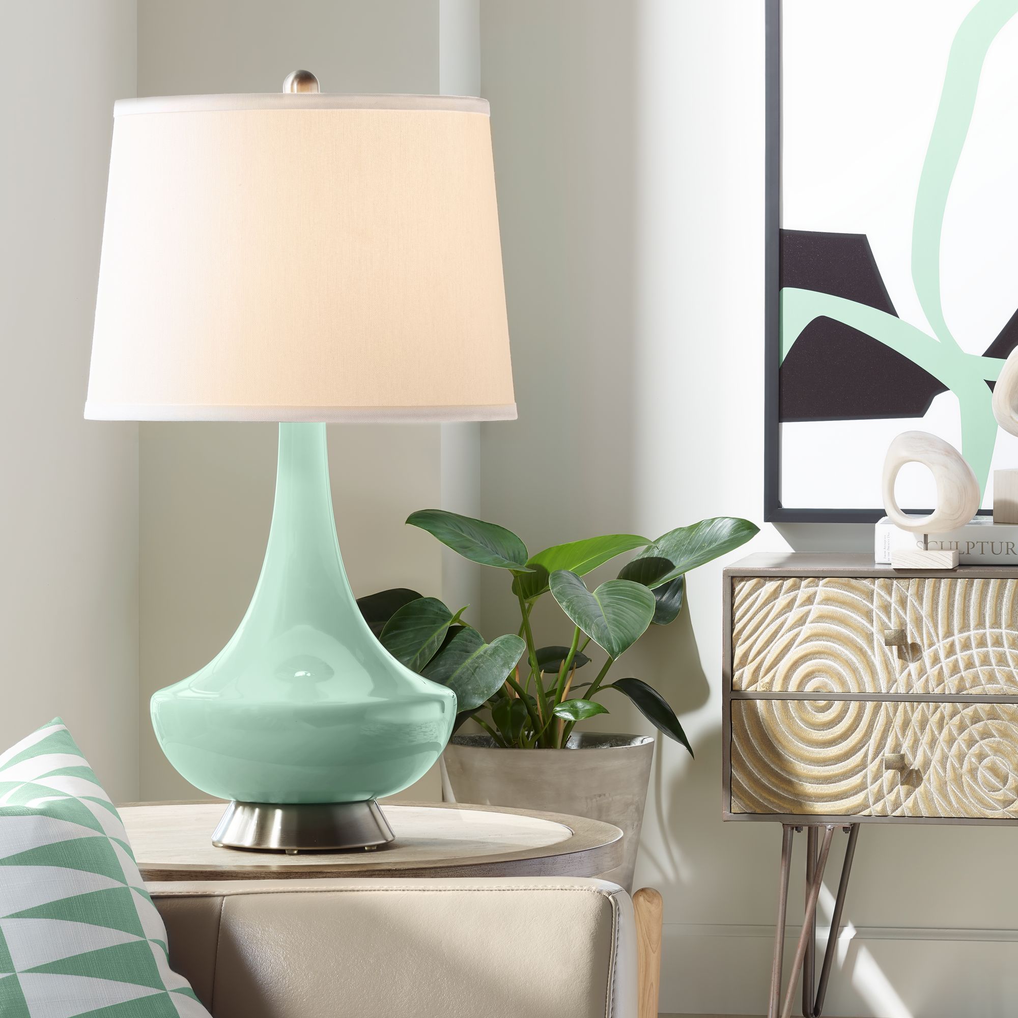 The luminous beauty of mercury glass is featured in this elegant table lamp design. The polished nickel finish base and accents complement the shine of the mercury glass pillar. A natural linen hardback shade adds texture to complete the look. Singly or in pairs, this glass table lamp design from Thumprints enriches any room in the home.