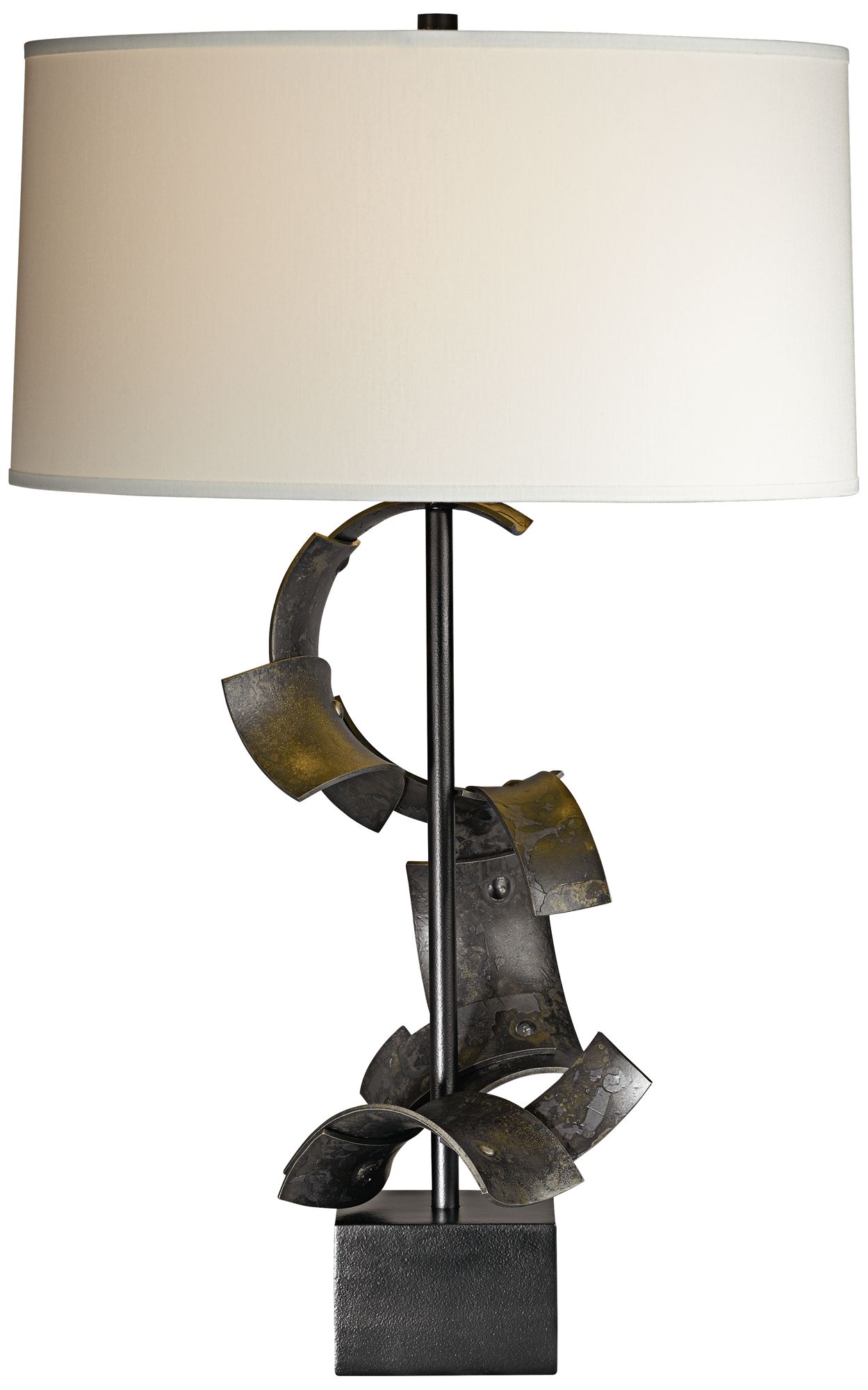 This table lamp has a wonderful contemporary line and geometric appeal. The open base comes in a dark rust finish. The rectangle shade on top is in a cream linen fabric. Twin light pulls let you easily adjust the light output.