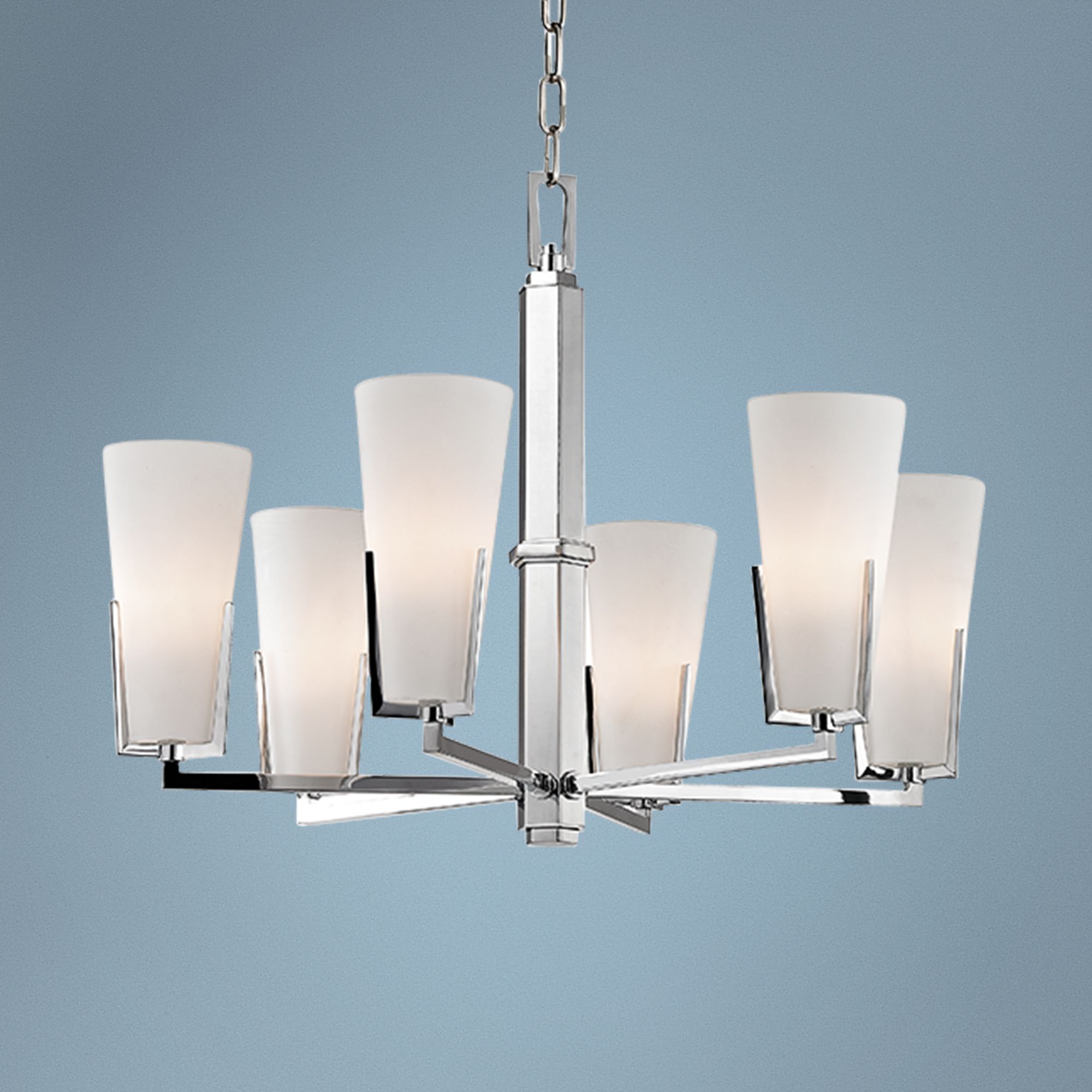 Inspired by the classic appeal of 19th-century France, this transitional dimmable eight-light crystal chandelier is an opulent addition. Featuring a chrome finish over steel frame construction, this fixture is fashioned with elegant layers of crystal octagons and spear-shaped drops. With exquisite lines of light-refracting crystals gently shaped into a bell shape, this elegant chandelier is for perfect for a formal dining room or front hallway.