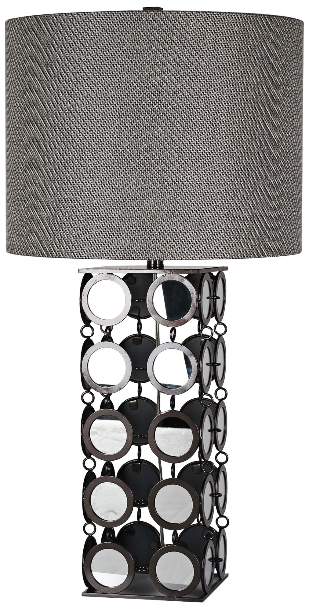 - Silver and amber brown color tones. Black finish pedestal accent at the very bottom of the lamp.