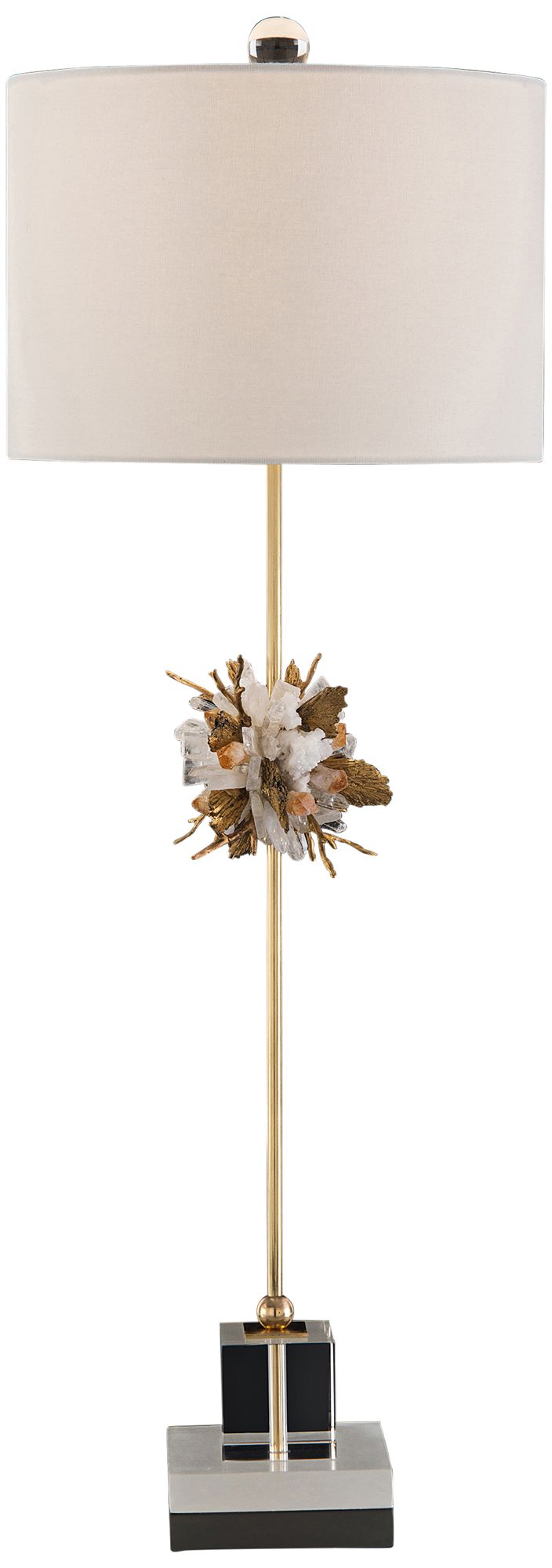 Read a book beside this glamorous ceramic table lamp from Robert Abbey. The golden glaze finish makes it shine, and the ball accents give it an interesting texture. The design is topped with a white shade. Design by Mary McDonald for Robert Abbey.