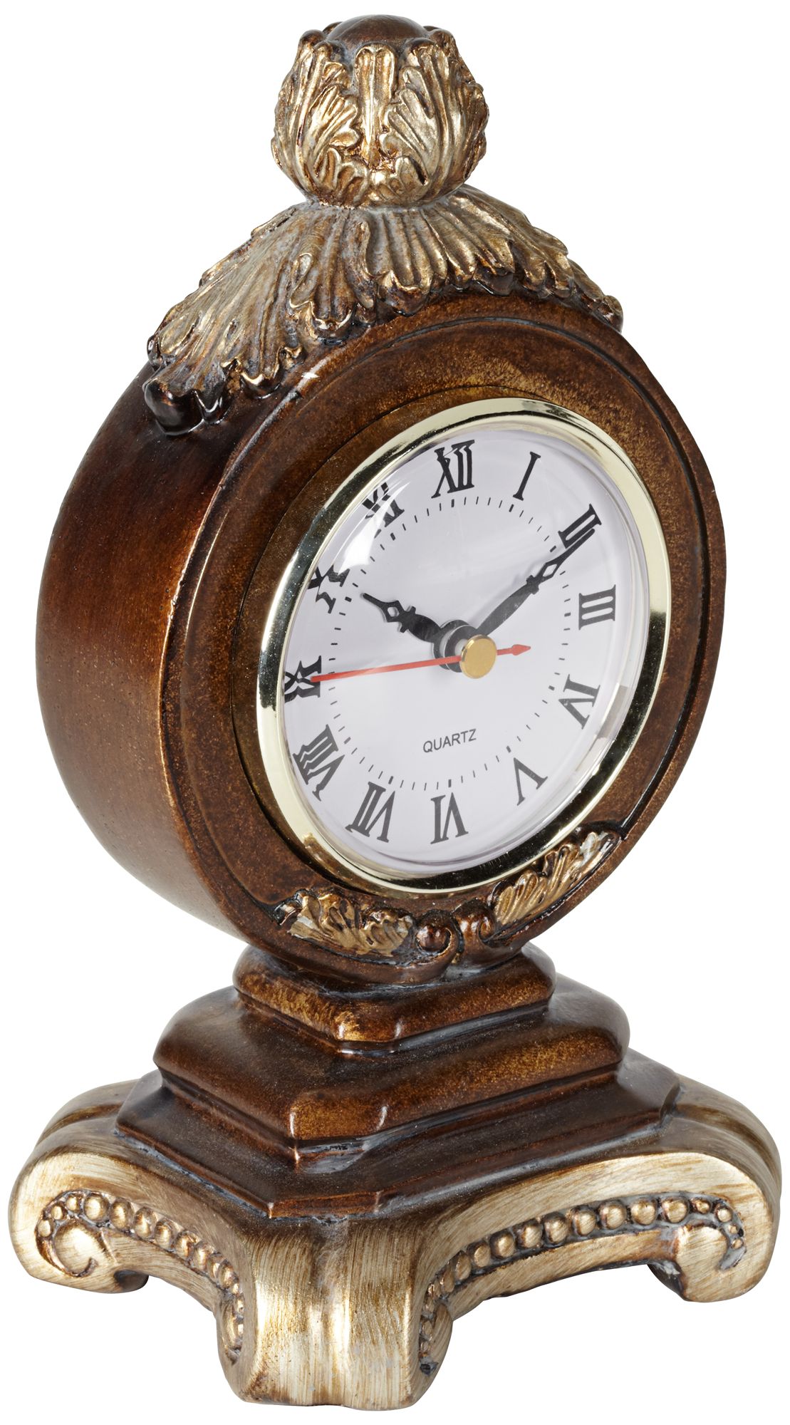 Regal in look, this traditional inspired table clock makes a great accent to tables, nightstands, and mantles. A brown finish is paired with a gold finished finial for added handsome style. A leaf motif completes this distinguished design.