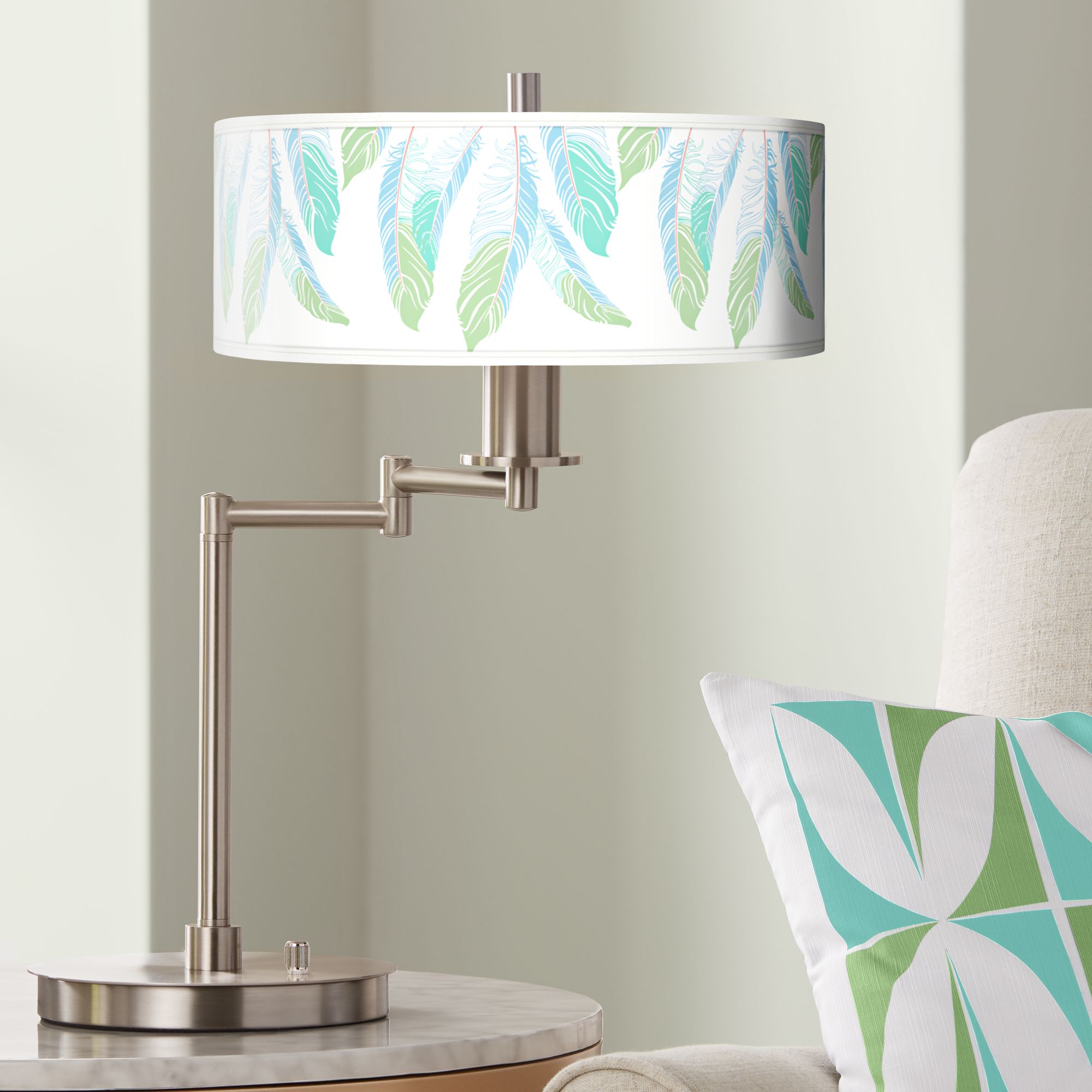 This energy-efficient desk lamp features a sleek brushed nickel finish. An adjustable swing arm and an on/off switch on the base offer convenience. A diffuser at the top of the drum shade prevents glare. Printed with a special giclee process which allows for rich color and intricate detail, the custom made-to-order shade of this desk lamp features a striking Concave pattern. Shade printing process U.S. Patent # 7,347,593.