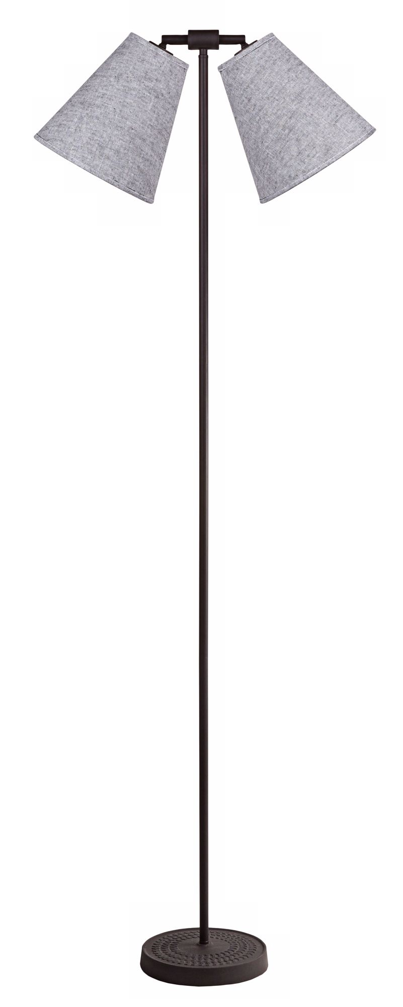 - Dark smoke finish. Steel construction. Flax fabric shade.