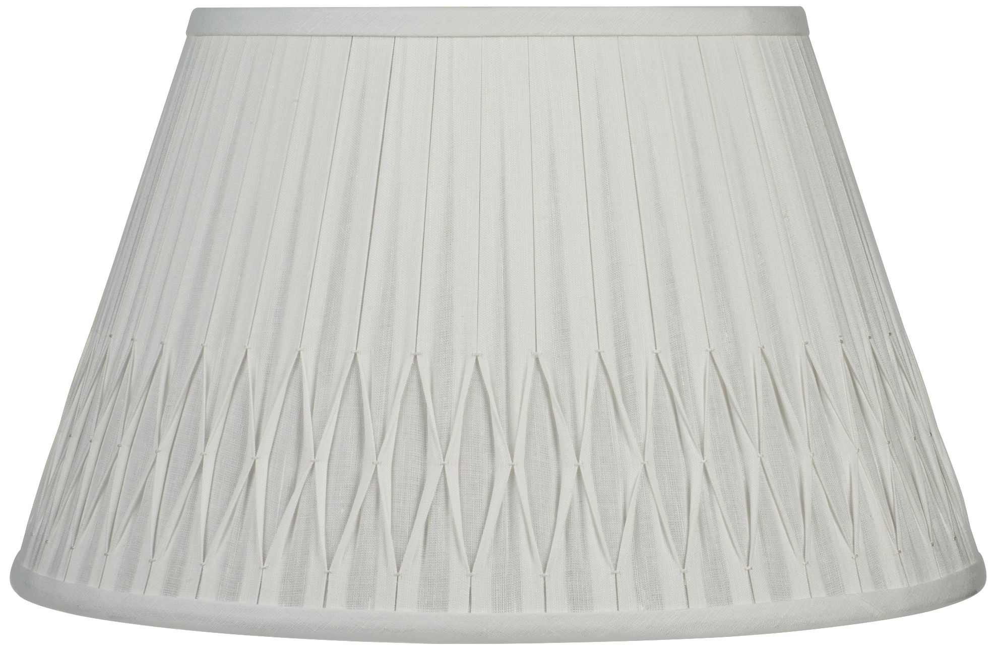 The white linen of this hardback drum shade has classic appeal. A stylish upgrade for your decor accented with chic silver scroll metallic thread lamp shade trim. A chrome finish spider fitter completes the look. The correct size harp is included free with this shade.