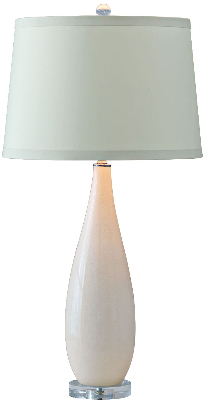 Make an elegant statement on a side table or console with this hand-cut glass table lamp from Port 68. Beautifully designed, the lamp features frosted blue glass with a curvy hourglass silhouette. Polished nickel accents complement a Lucite base and crystal ball finial. A polyester drum shade assures soft, diffused lighting for any room.