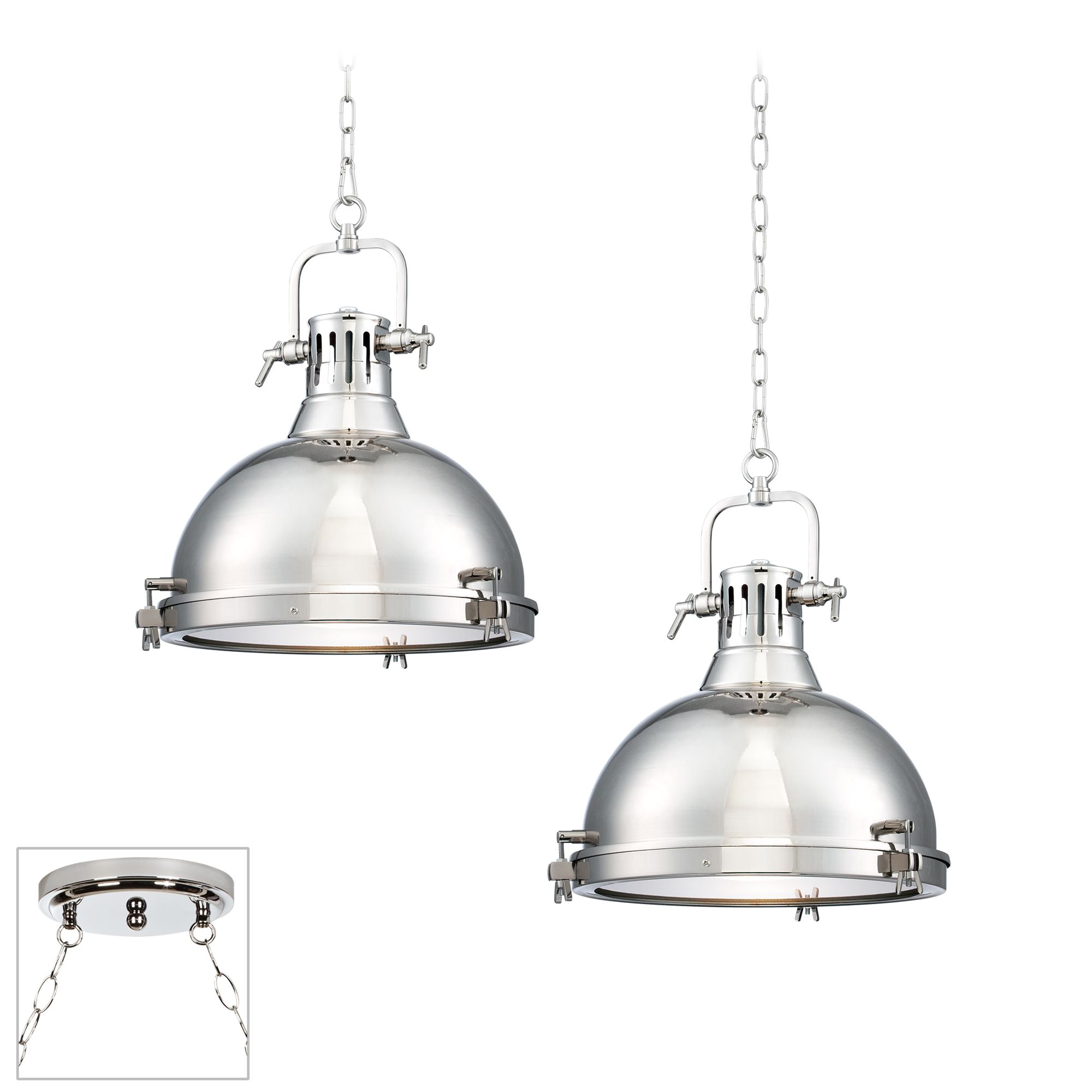 - 2-light pot rack chandelier. Satin steel finish. Steel construction.