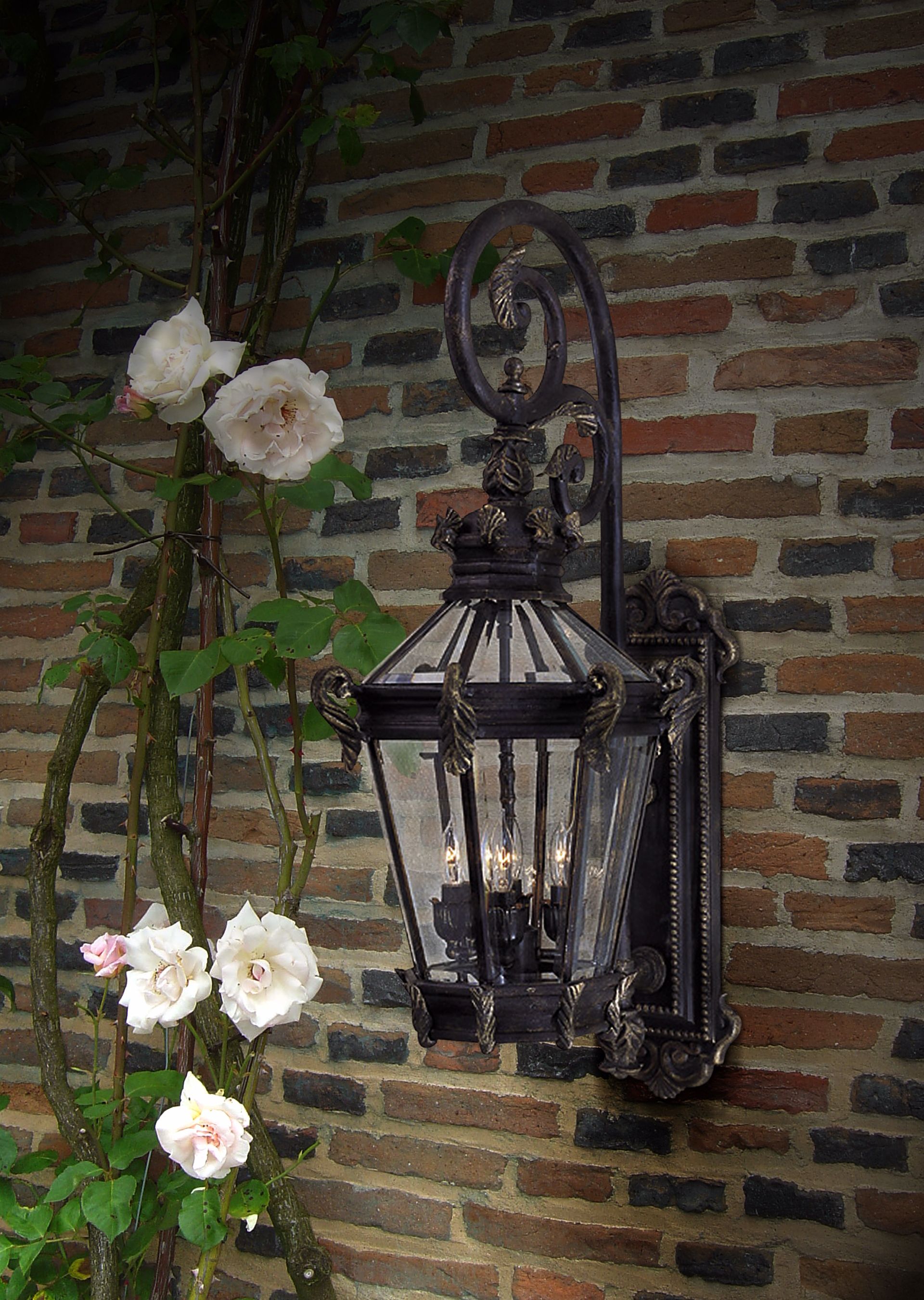 A rich warm brilliance adds to the beauty of this traditional outdoor lantern from Minka Lavery. It offers timeless beauty with its beveled glass, metal candle sleeves and hand painted ornate Heritage™ finish with gold highlights.