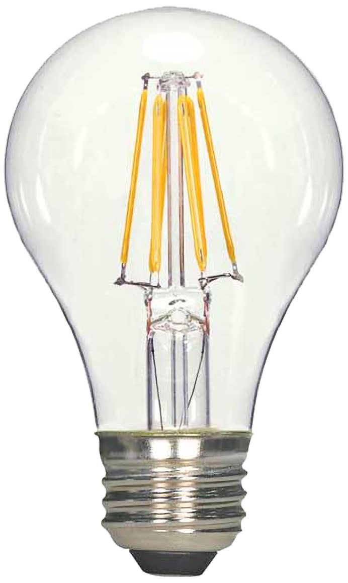 - Clear, dimmable filament LED light bulb.