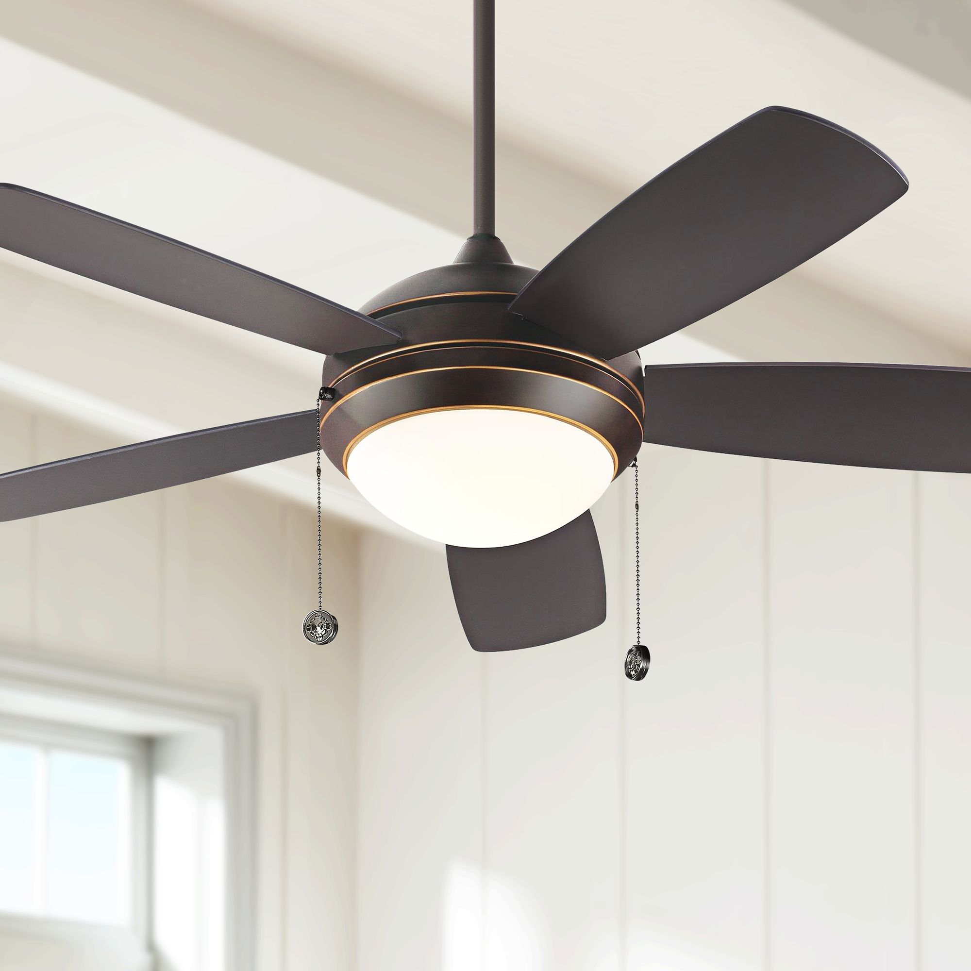 Upgrade to the contemporary look and feel of this Roman bronze LED ceiling fan from Monte Carlo. Delivering a familiar five-blade silhouette, the fan is updated with an integrated, energy-efficient LED light and matte opal glass diffuser and Roman bronze finish reversable blades crafted from American walnut. Its 44-inch blade span and 12-degree blade pitch are complemented with a 20-watt LED light that's comparable to a 75-watt incandescent.(MAP)