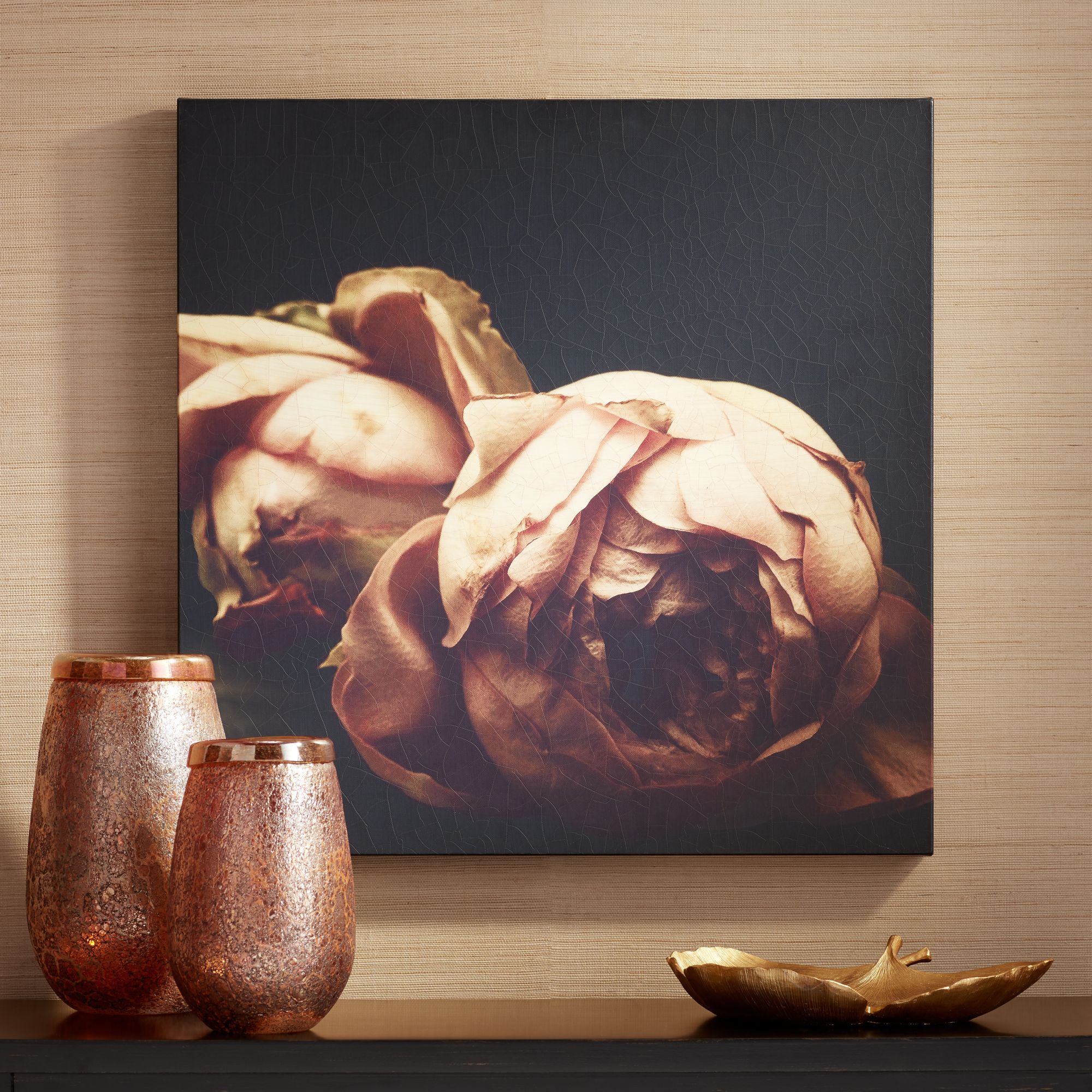 A soft pink floral arrangement is the highlight of this square wall art. Beautiful flowers are showcased against a deep black background that creates appealing contrast. A crackle finish is a stylish last touch.