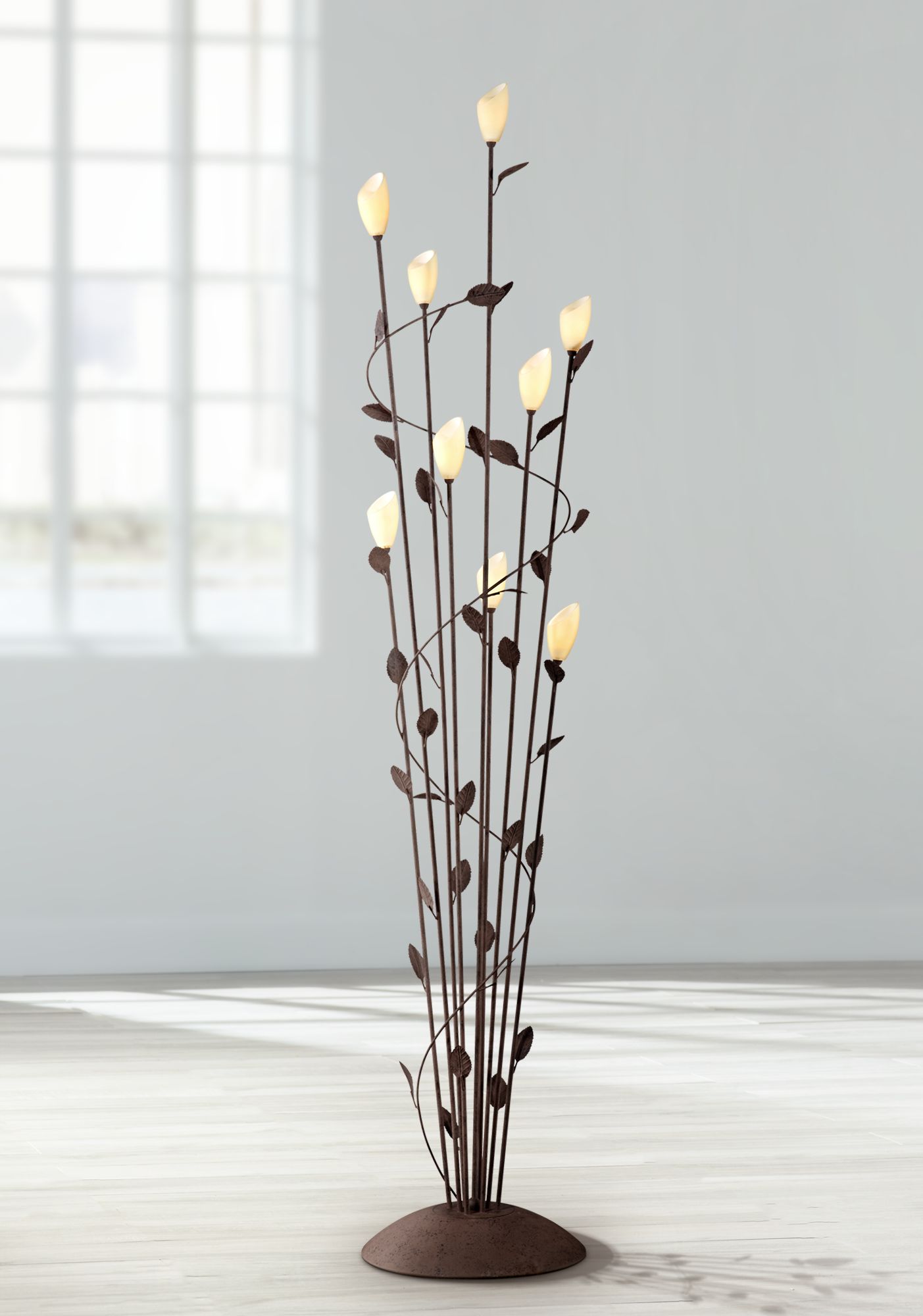 This life-like depiction of twisted vines is a wonderfully artistic accent for living rooms, great rooms, bedrooms, and more. All-metal construction and rust finish create an organic yet elegant focal point. Nine glass shades are beautifully styled as delicate flowers.