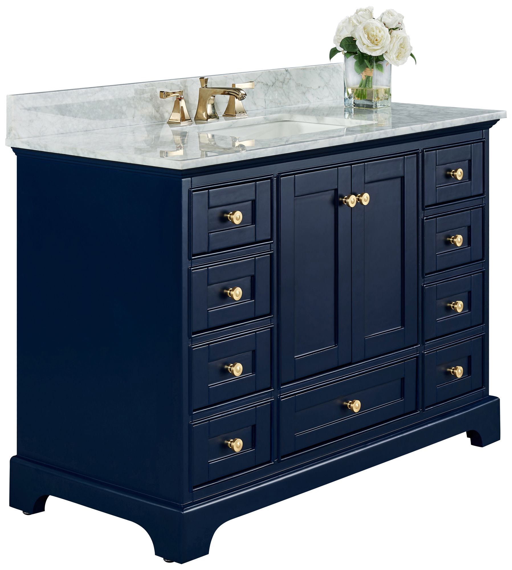 Refined taste yields a sophisticated look with soft farmhouse style, adding to the ambiance of a transitional master or guest bath. With a beautiful heritage blue finish over solid birch wood construction, this Audrey nine-drawer, single sink bath vanity shows off upscale elements. Hand-crafted with solid and hardwood, it delivers ample drawer and cabinet space to stash essentials, with ease of operation in soft-close drawers and doors. A luscious Italian Carrara white marble top and white undermount basin joins gleaming gold finish hardware to form a truly decadent look. By Ancerre Designs.