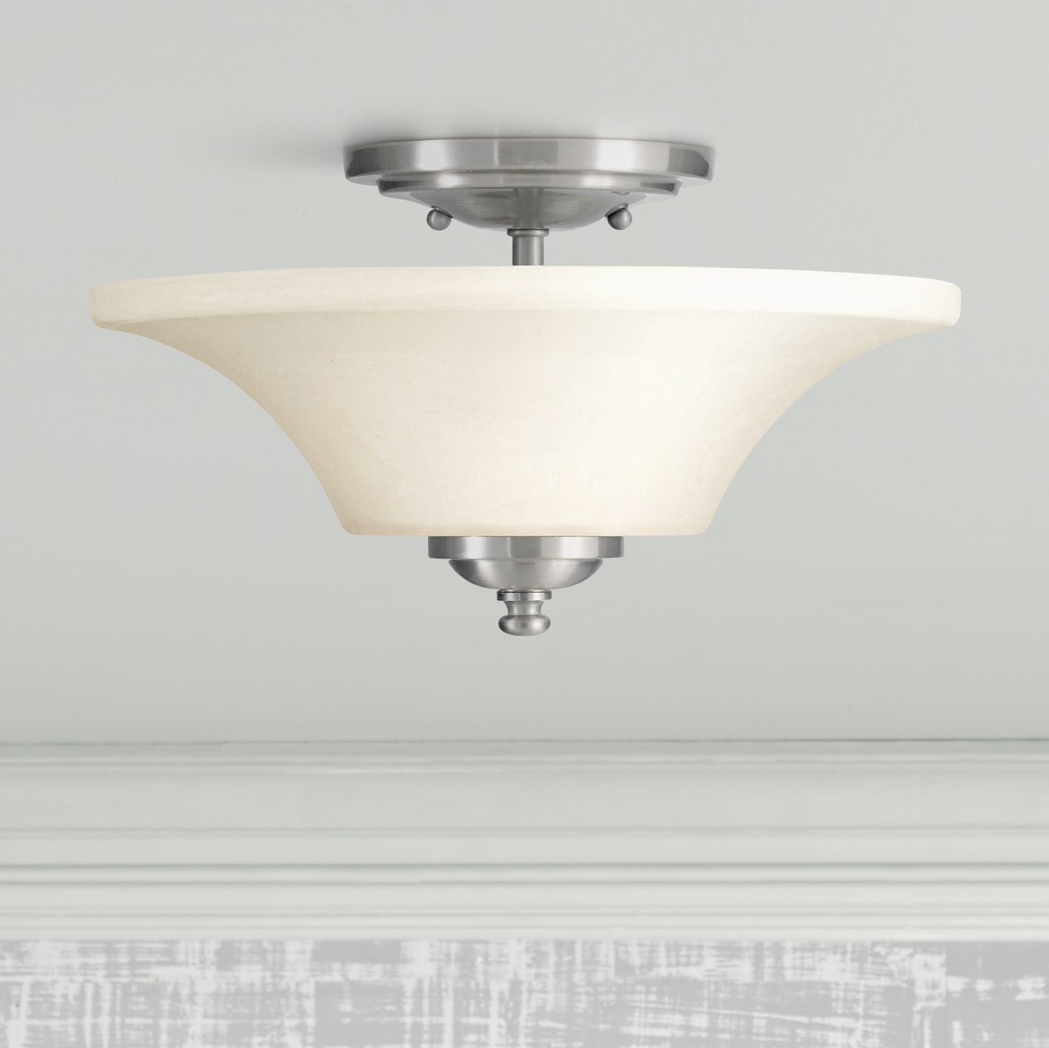 Part of the Barrington Collection from Feiss, this ceiling fixture features an angular line and an arched design. Its brushed steel finish combines handsomely with its opal etched-glass shade.