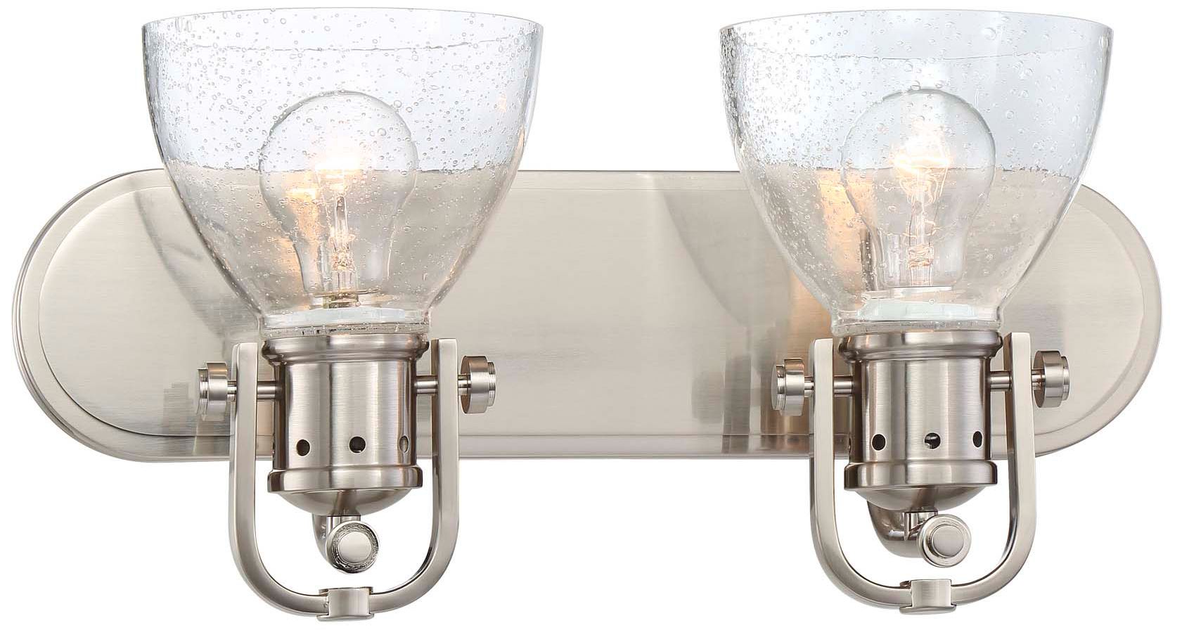 A chic take on classic industrial style, this two-light brushed nickel bath fixture revels in transitional allure. Its rugged metal framing is enhanced by seeded clear glass over the bulbs. May be hung up or down. From Minka Lavery.