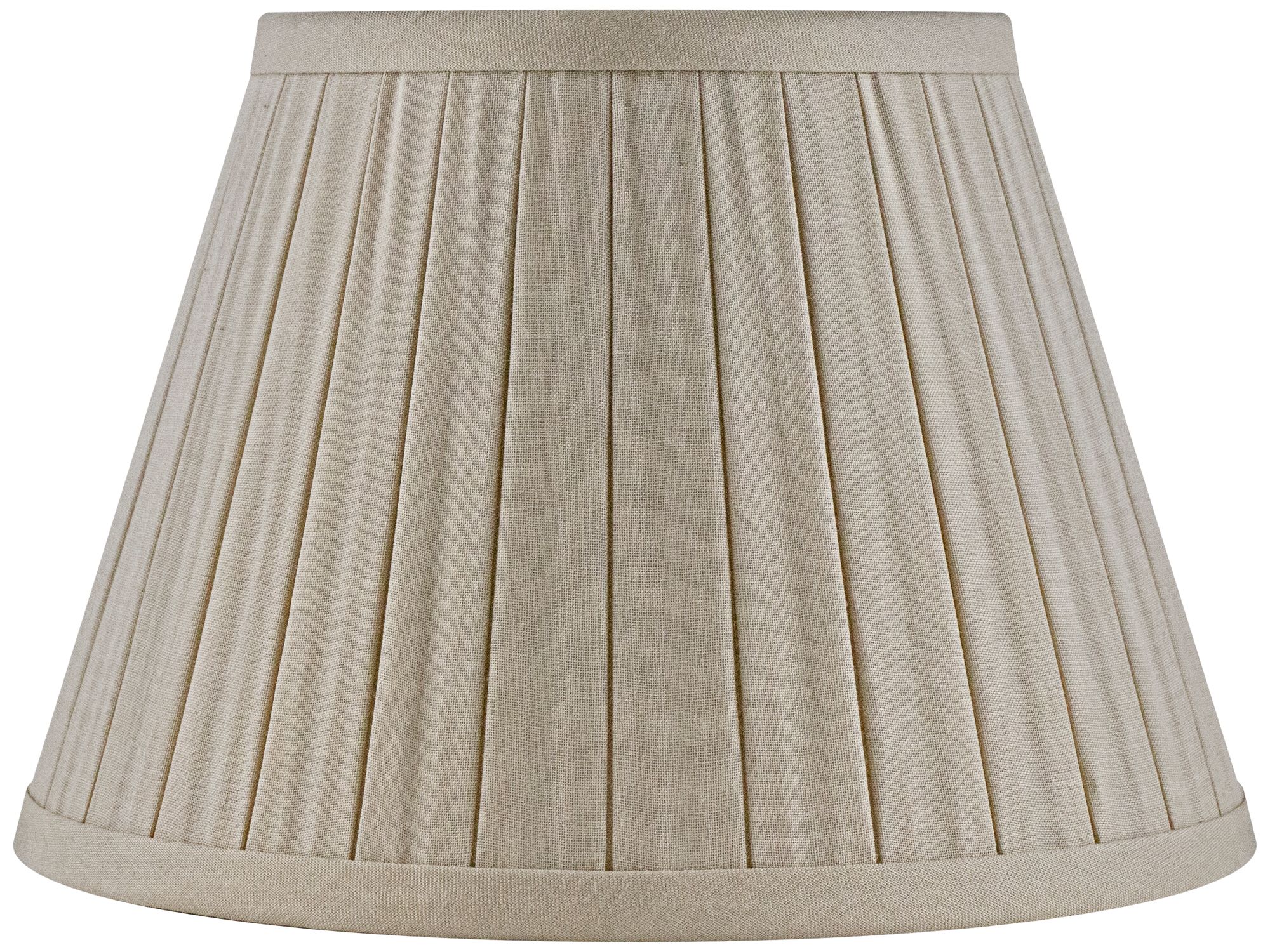This attractive softback linen box pleated spider empire lamp shade adds style to your favorite lamp. It features beige linen material with a beige poly lining that makes for an appealing visual contrast to a dark stand or base. The clip-on fitter is fashioned with a lovely champagne finish. It's eight inches across the top and twelve inches across the bottom and includes a finial and the correct size harp.