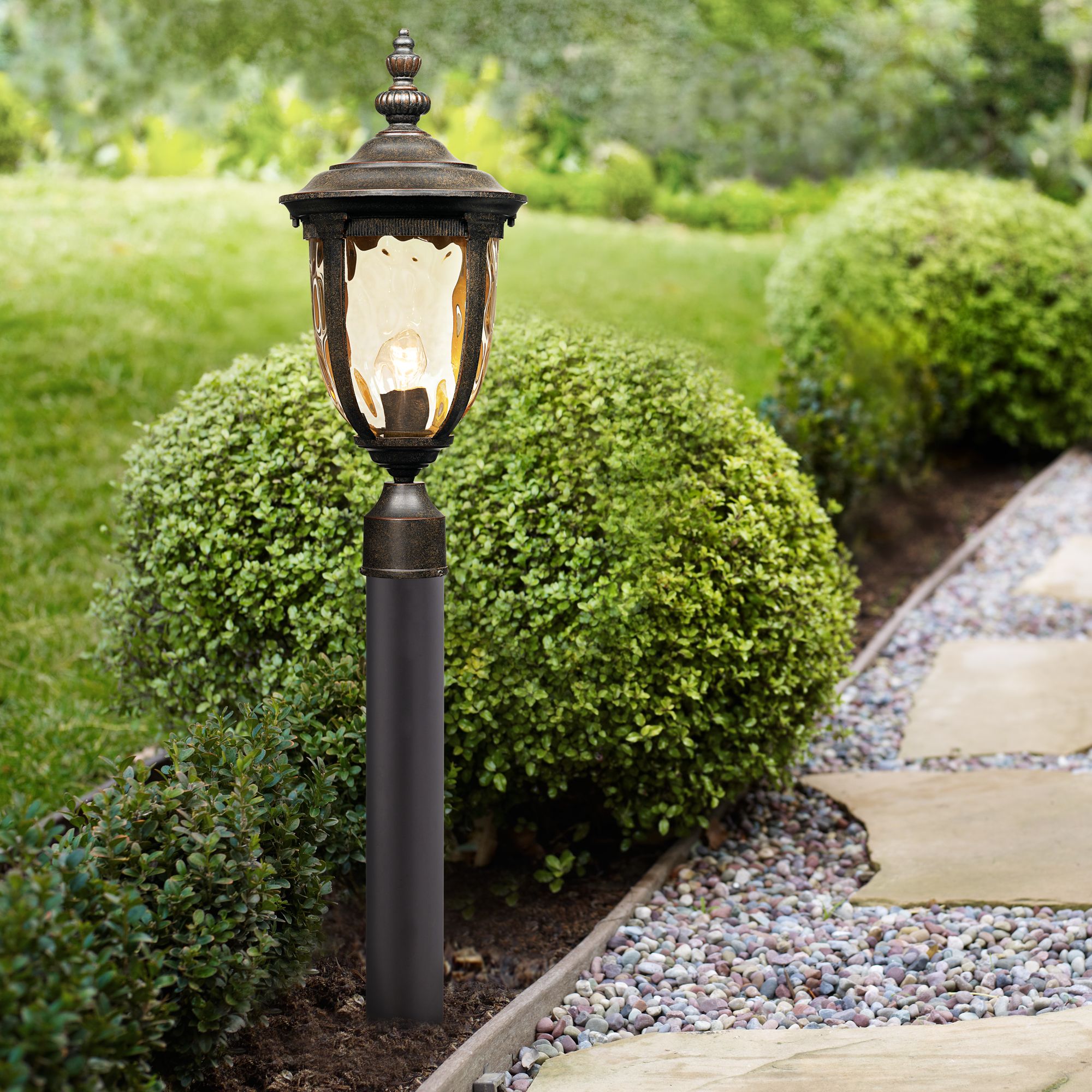 With a romantic ambiance fit for a custom exterior space, this outdoor post path light offers an inspiring finish to carefully designed pathways and gardens. This complete 37-inch light from the Bellagio collection by John Timberland® features an alluring veranda bronze finish light with champagne-style hammered glass. Complementing a matte black finish pole and ornate frame accents, this chic traditional style light softens the mood. Outdoor rated and energy-efficient, this complete post path light works with low-voltage landscape lighting systems.