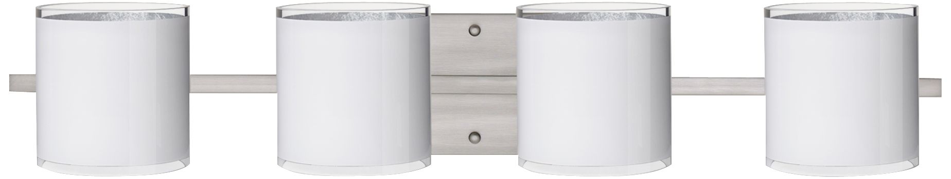 - Satin nickel finish. White shade with inner silver coloring.