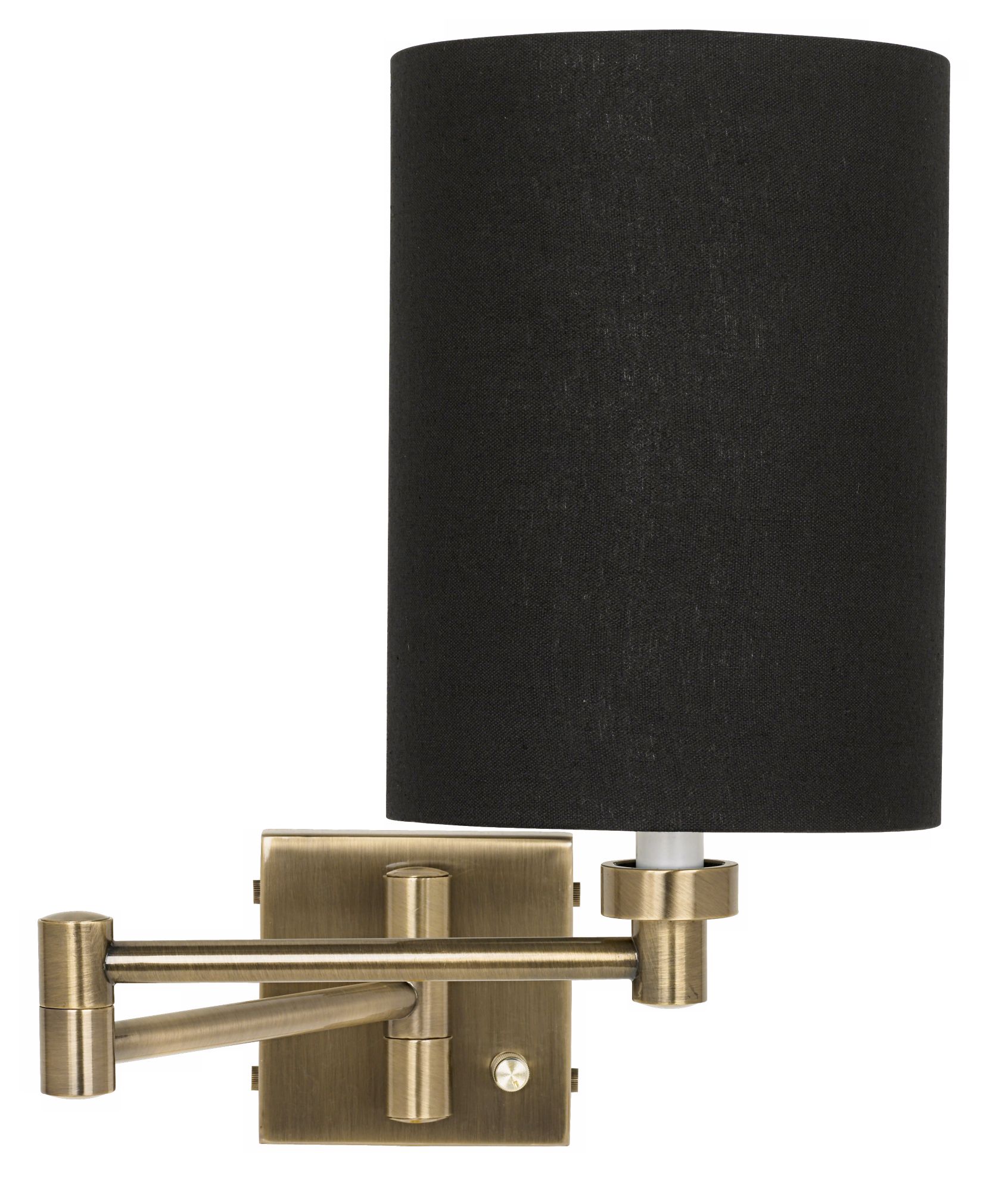 With an emphasis on functionality, this contemporary swing arm wall lamp is a great addition to any room. It features a handsome antique brass finish and a modern black linen cylinder lamp shade. A full range dimmer switch is located on the backplate. The plug-in style makes this lamp easy to install and use. Simply attach the lamp to the wall and plug into any standard outlet using the provided cord.