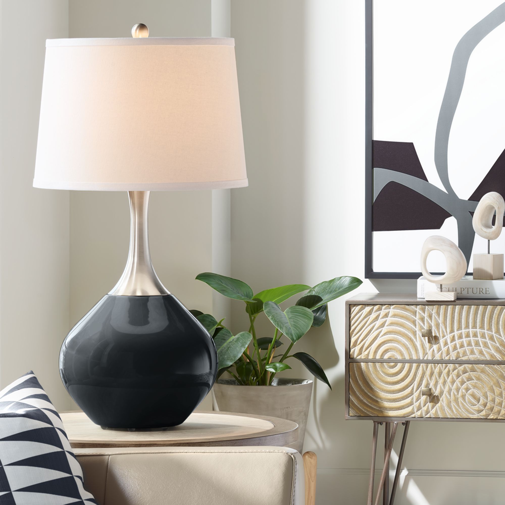 The Spencer Color + Plus™ table lamp is an exquisite home style upgrade. Hand-crafted by experienced artisans in California, the base features a beautiful Black of Night color tone that is elegantly complemented by a graceful metal lamp neck in brushed nickel finish. A coordinating finial over the plain white tapered drum shade draws the look together and completes the design. Lamp base U.S. Patent # 8,899,798.
