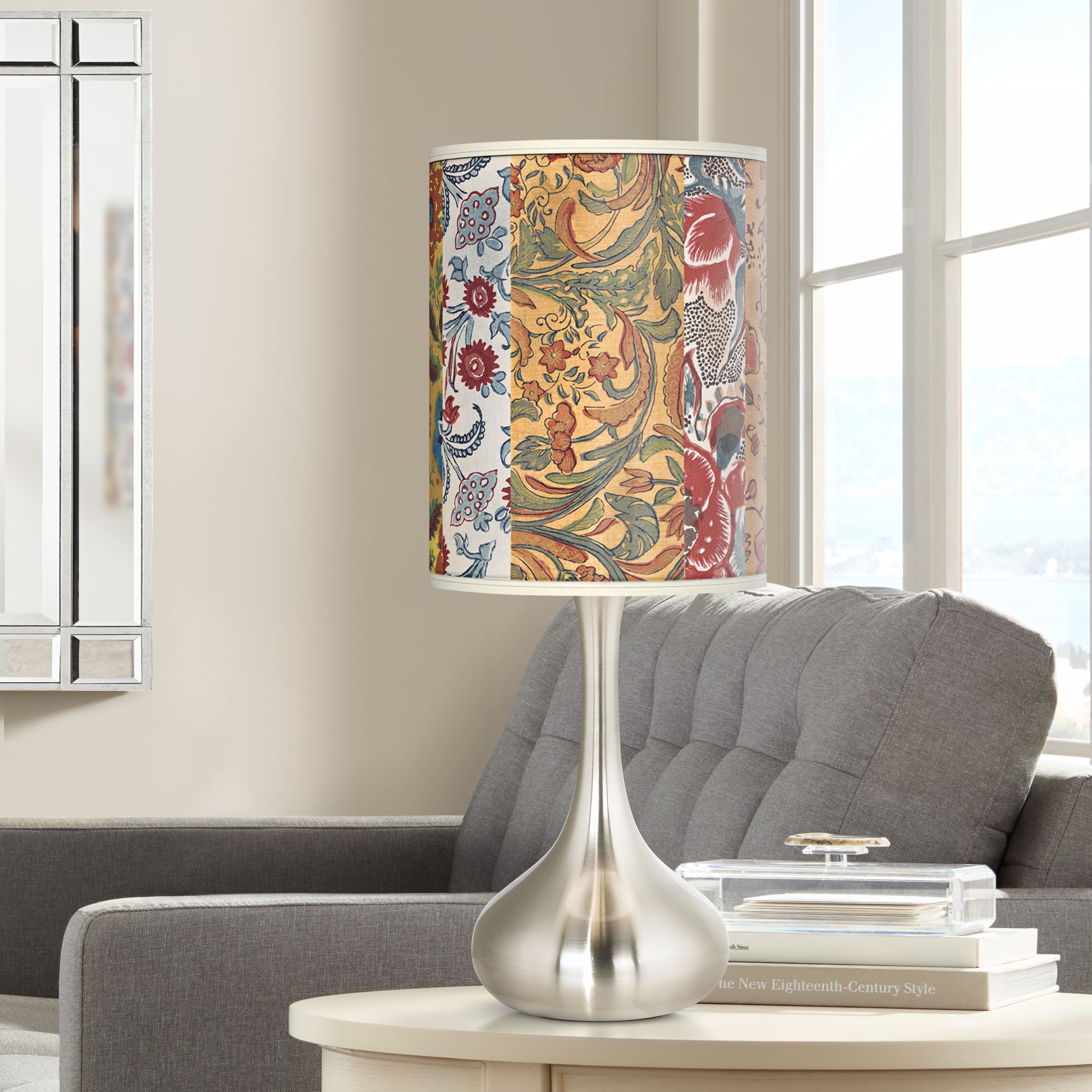 Refined simplicity is yours with this modern table lamp design. The metal base offers a graceful sculpted shape that's presented in a brushed nickel finish. Topped with a giclee cylinder shade that's custom printed with a stylish Bohemian Blooms pattern. U.S. Patent # 7,347,593.