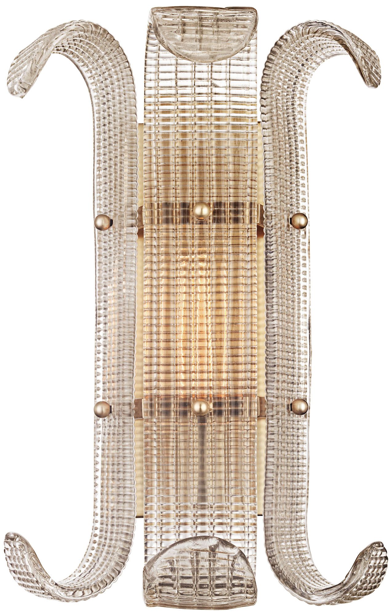 Hudson Valley's Brasher 1-light wall sconce is a contemporary aged brass-finished metal light fixture ideal for dry locations. Watch the luxurious hand-poured glass panels and champagne hues refract light and fill your favorite indoor space with elegance and class. Get ready to transform dining and living spaces with the lovely charm of this original sconce.