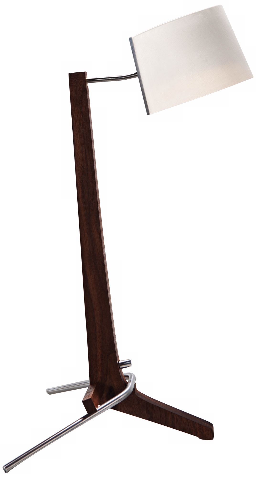 - Black stained walnut wood body. Adjustable white linen fabric shade. Aluminum leg and knob.