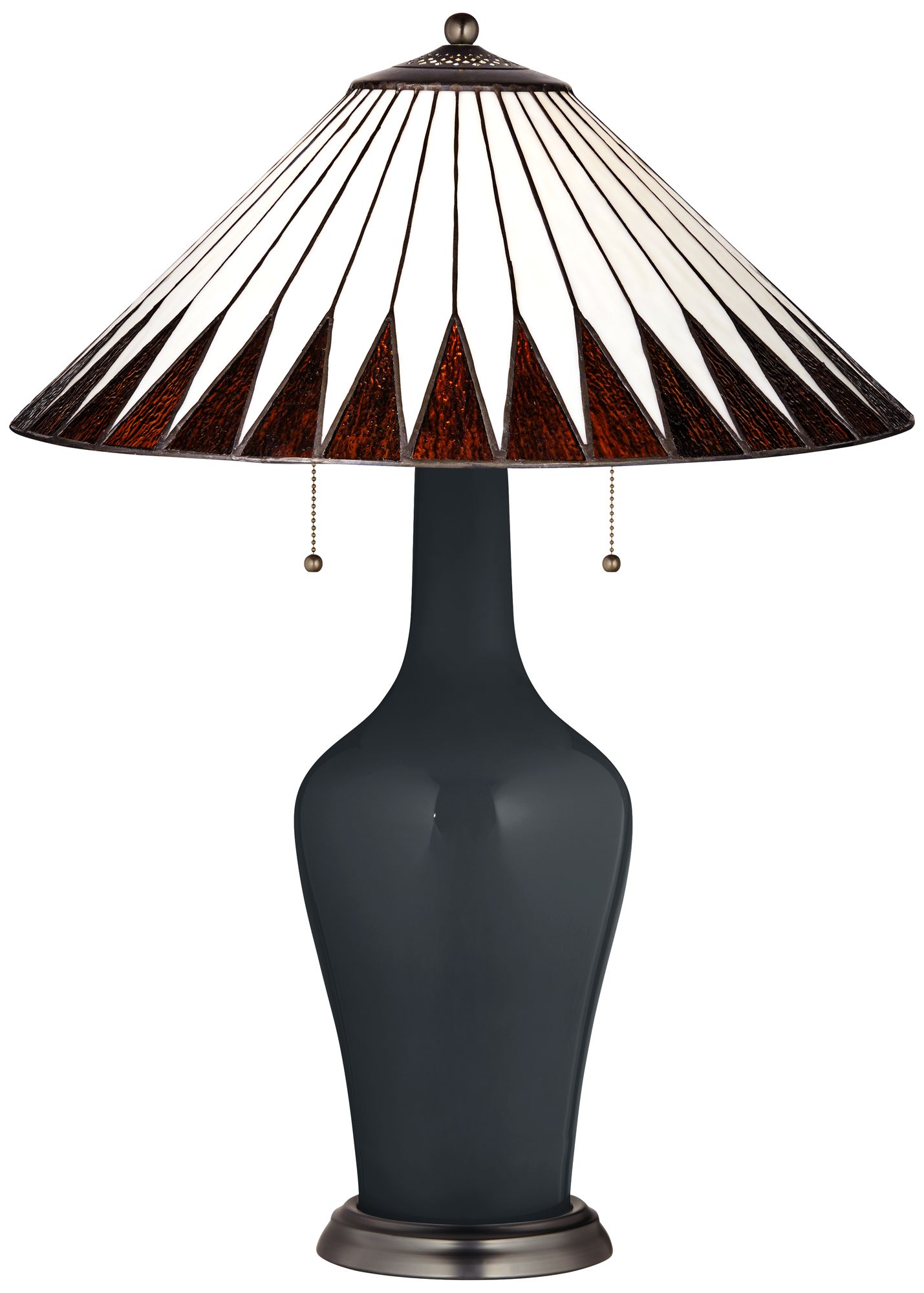 Bring a refreshing accent home with the updated, designer look of this glass table lamp from the Tiffany Color + Plus lighting collection. The lamp is hand-crafted and made-to-order by experienced artisans in our California workshops, and features a beautiful Black of Night base color tone. It is topped with the Feather Geometric pattern shade crafted from 68 pieces of hand-cut art glass soldered together with traditional Tiffany-style copper foil technique. The design is completed with an antique brass finish metal stand and matching pull chains. Please note - because the shade is handmade, there may be slight variations in glass color, shape and pattern. Lamp base U.S. Patent # 8,899,798.