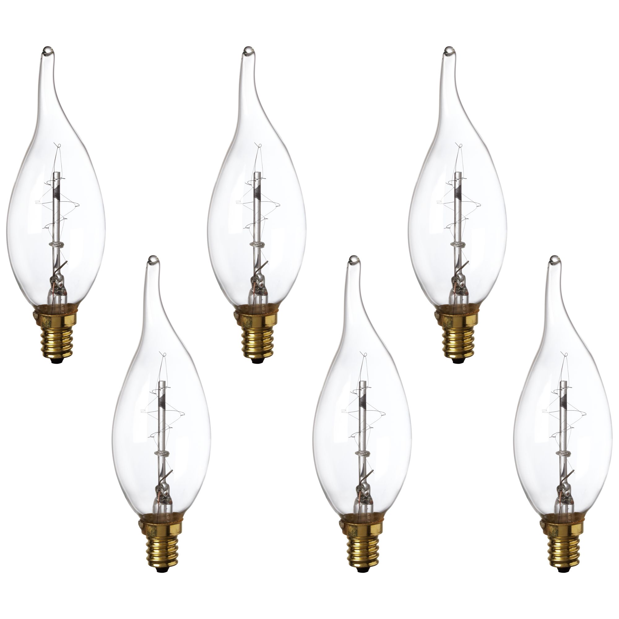 This six-pack of classic 60 watt Candelabra light bulbs is patterned after the Edison style bulbs at the turn of the 19th century. It's ideal for use in fixtures where the bulb is visible and where you'd like to add an antique, nostalgic look. Features a flame tip design. Six bulbs per pack; price is for six bulbs.