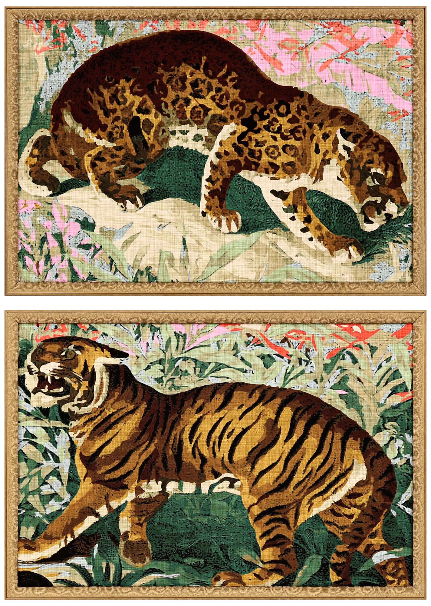 Bring an exotic touch and vivid color with this two-piece framed giclee wall art set. Each piece features a single brown jungle cat on the prowl across colorful tropical foliage. Lending energy and movement to your space, these art pieces are printed on paper and rest under glass surrounded by gold finish wood frames.