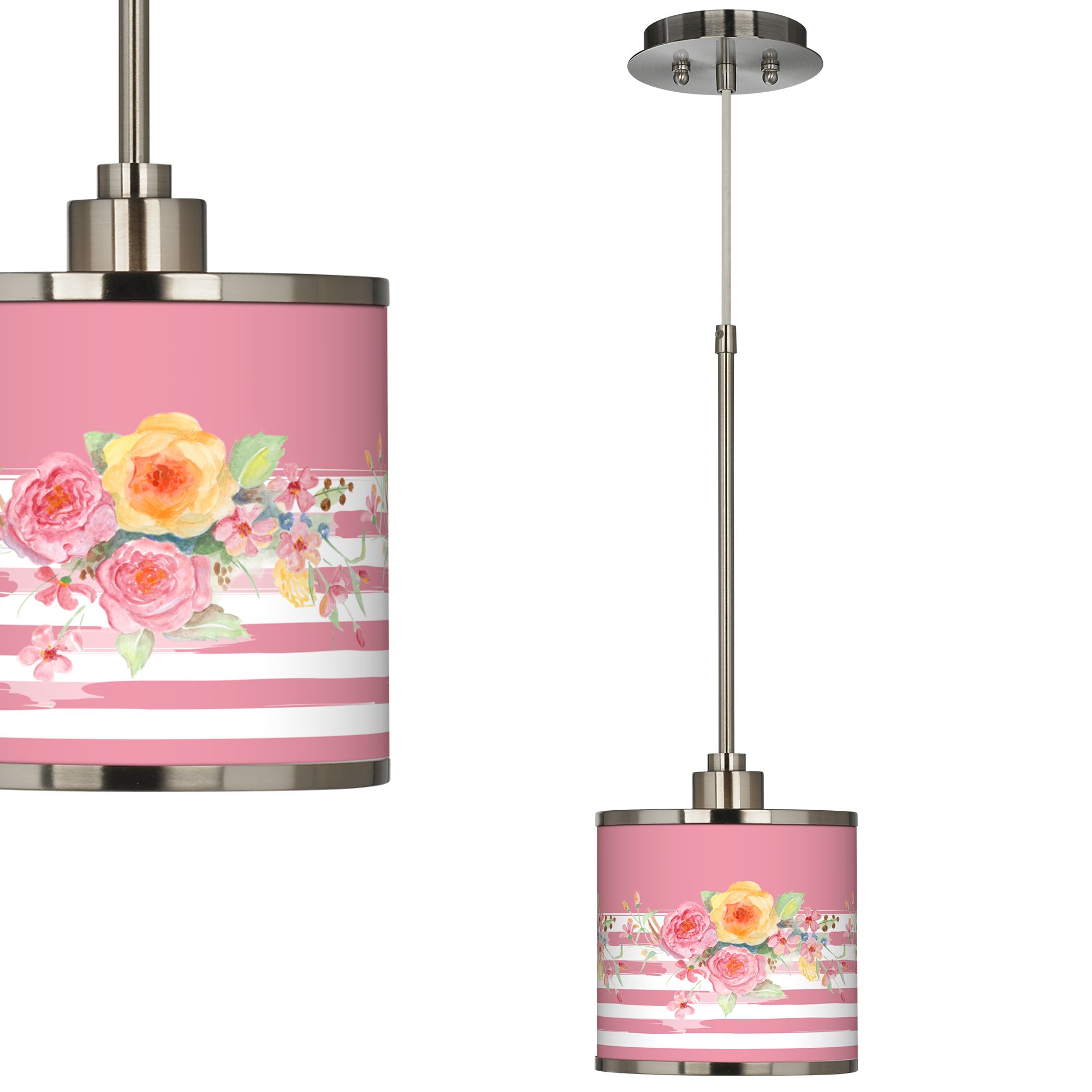 Add a dash of stylish lighting with this sophisticated and compact pendant light. The design features an exclusive Country Rose pattern custom giclee printed on a translucent shade. This high-quality material allows warm light to shine through the shade, illuminating the pattern and creating a spectacular look. This stylish fixture is custom made-to-order. Shade printing process U.S. Patent # 7,347,593.