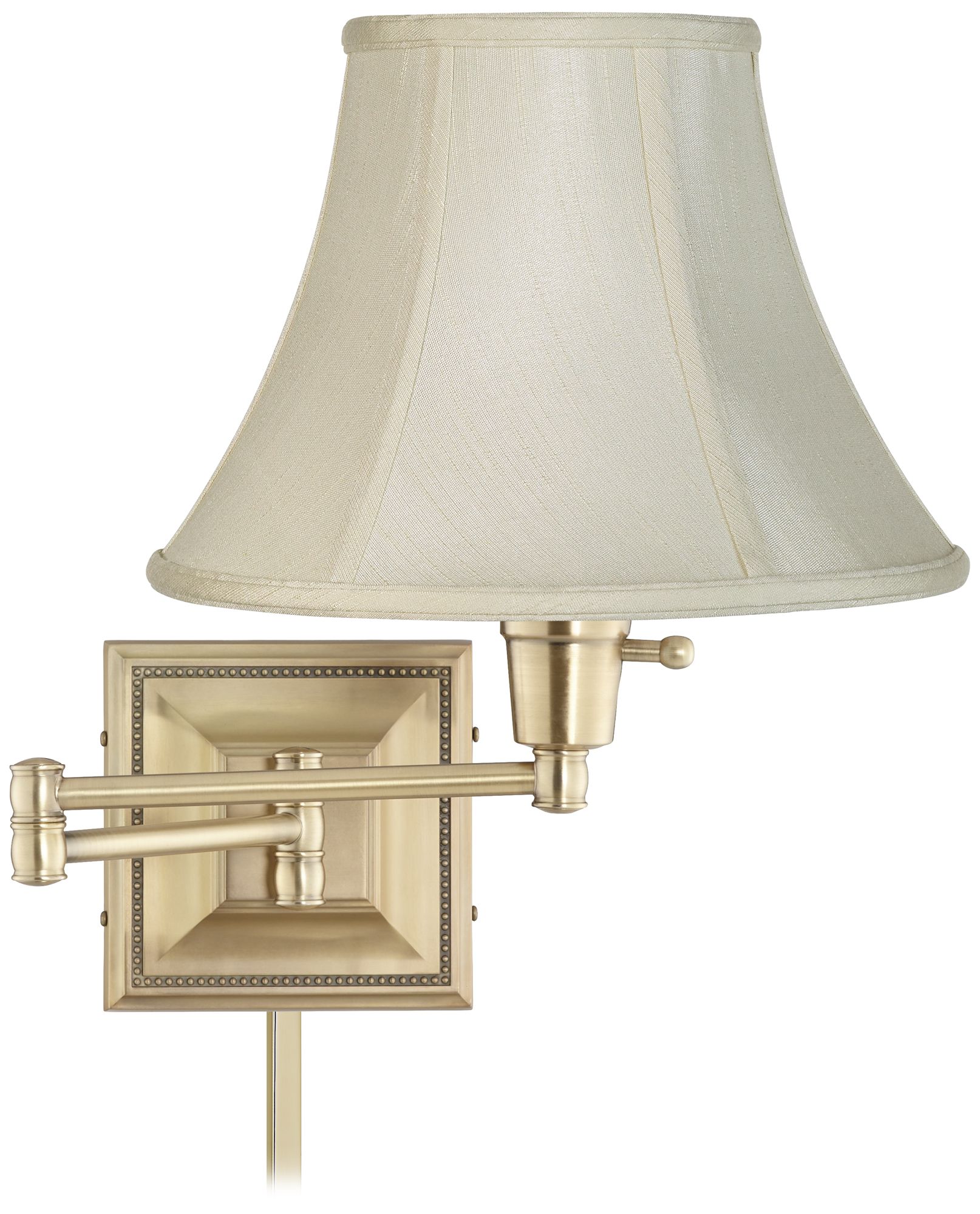 This brushed brass finish, plug-in style swing arm wall lamp is perfect for bedrooms or seating areas. A beautiful creme fabric bell shade highlights the glistening frame and beaded backplate. Enjoy ideal lighting levels with the included full-range dimmer. Comes with six feet of clear cord that plugs into any standard wall outlet. Includes a brushed brass metal cord cover to keep the cord out of sight for a clean and tidy look.