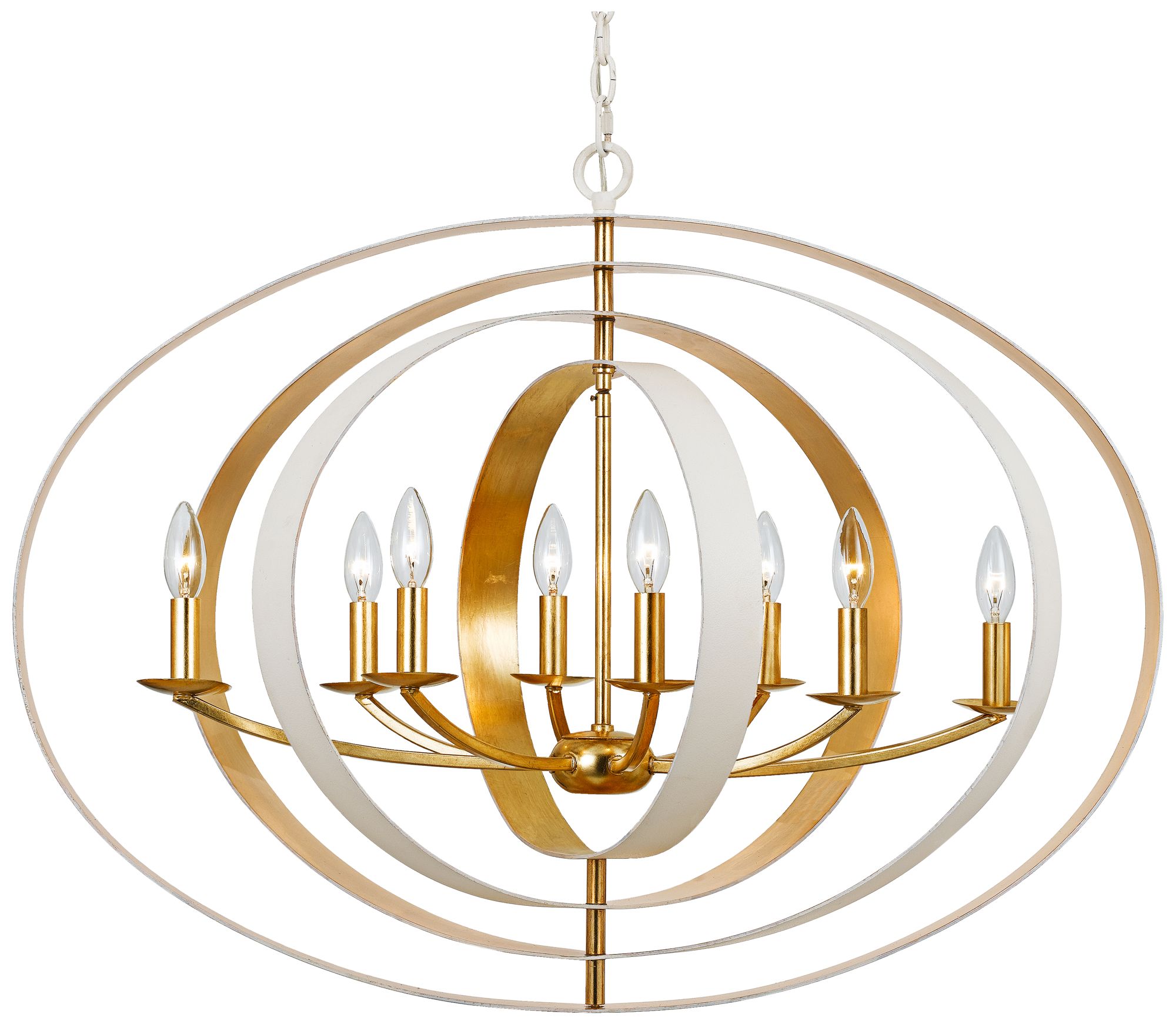 Make a statement with this stunning transitional eight-light chandelier from Crystorama. This stylish light is trimmed by a collection of lustrous, layered wrought iron rings with a two-tone matte white and antique gold finish. Shaded solely by the ring framework, this fixture offers a captivating output.