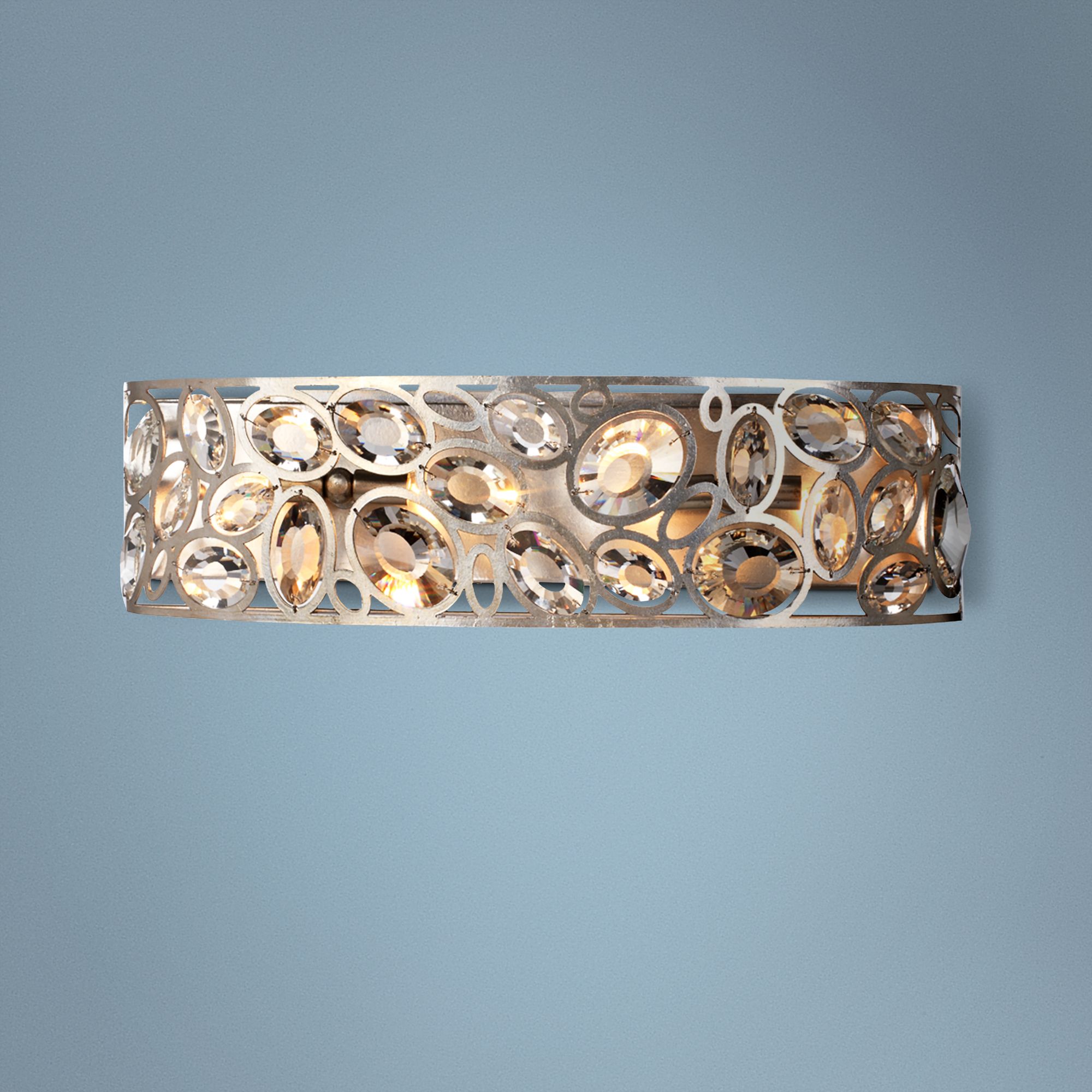 Turn your bathroom into an abstract-modern show place with this wide, rounded-front four-light wall fixture. A frame of metal rings in golden-silver distressed twilight finish contain glimmering, graduated crystal gem details that sparkle throughout the room. A fashionable, ADA-compliant home decor accent from Crystorama lighting.