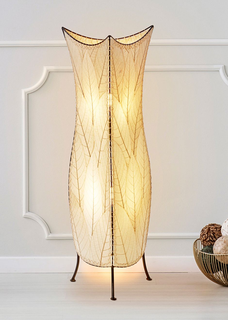 Reminiscent of a curved floral shape, this large tower table lamp sits on a metal frame. With layered cocoa leaves in a neutral natural color. From the Flower Bud collection by Eangee.