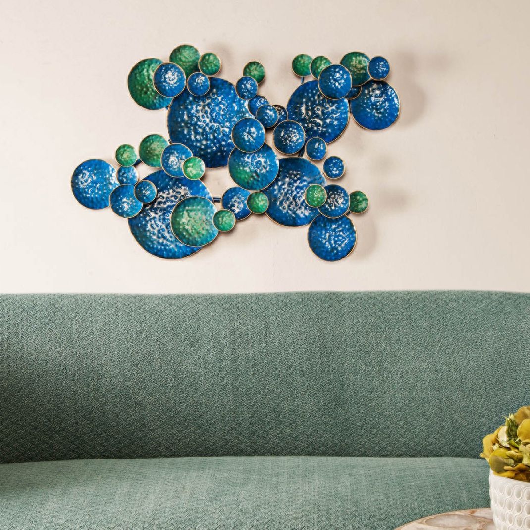Inject a little energy into your living space with the lively color of this metal wall art piece. Beautiful in an entry or living area, the piece boasts iron construction with a layered arrangement of variously sized discs. Each boasts a textured surface with a mix of blue and green finishes that offer vibrant, effervescent style.