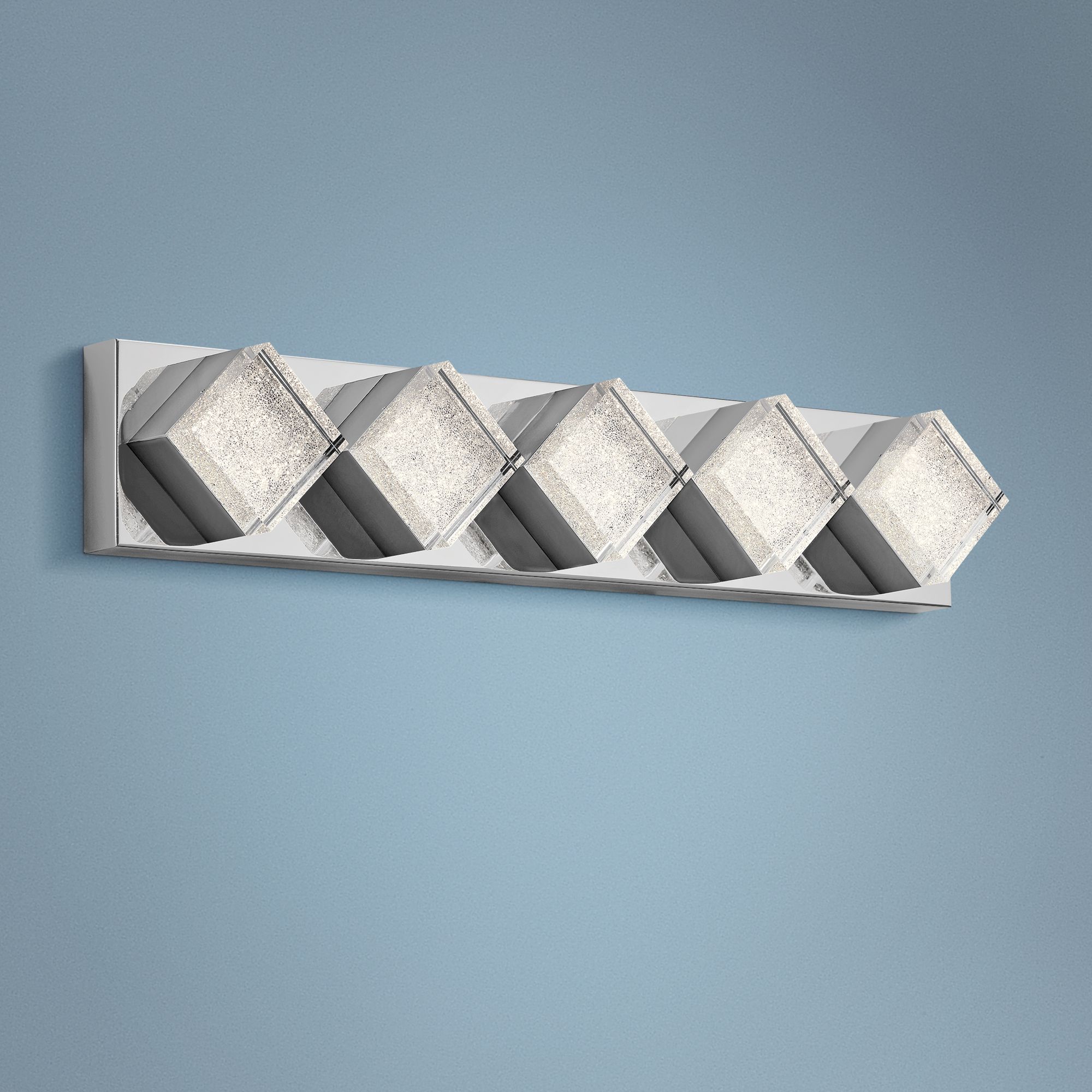 This beautiful five-light linear bathroom fixture has a steel back plate and five square frames attached diamond-like at 45 degrees. Finished in glistening chrome, each holds a bright LED module behind a sparkling clear cubic zirconium chip diffuser panel. An incredibly chic, energy-efficient modern bath light from Elan.
