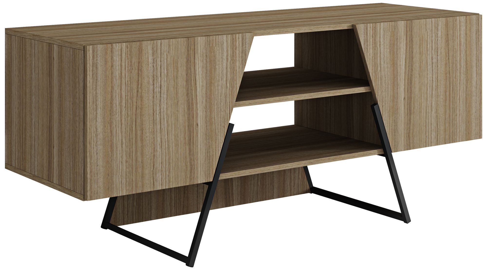 - Features two storage compartments, two center open shelves for wire management, and two 90-degree open doors with slanted trim design.