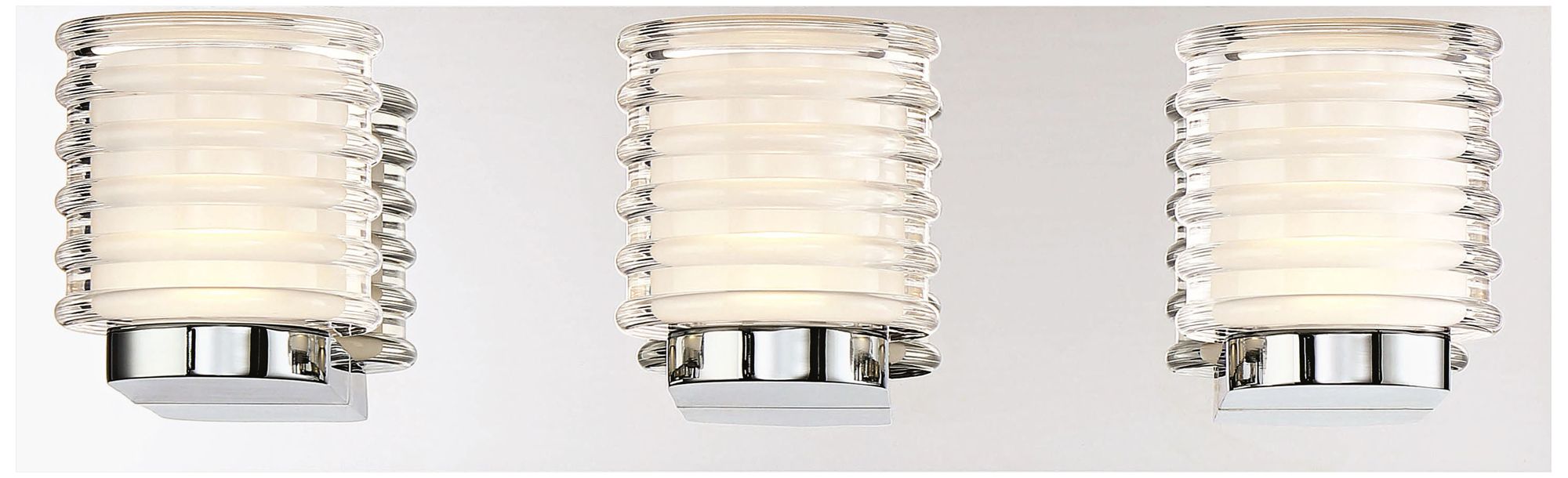 Art meets lighting in this delicate-looking fixture from Eurofase. Attention to design detail offers a trio of stylish ridge-embellished frosted white shades dressed up with a sleek chrome finish base and wall mount. This chrome and frosted acrylic three-light bath light is energy-efficient and accommodates optional dimmer components.