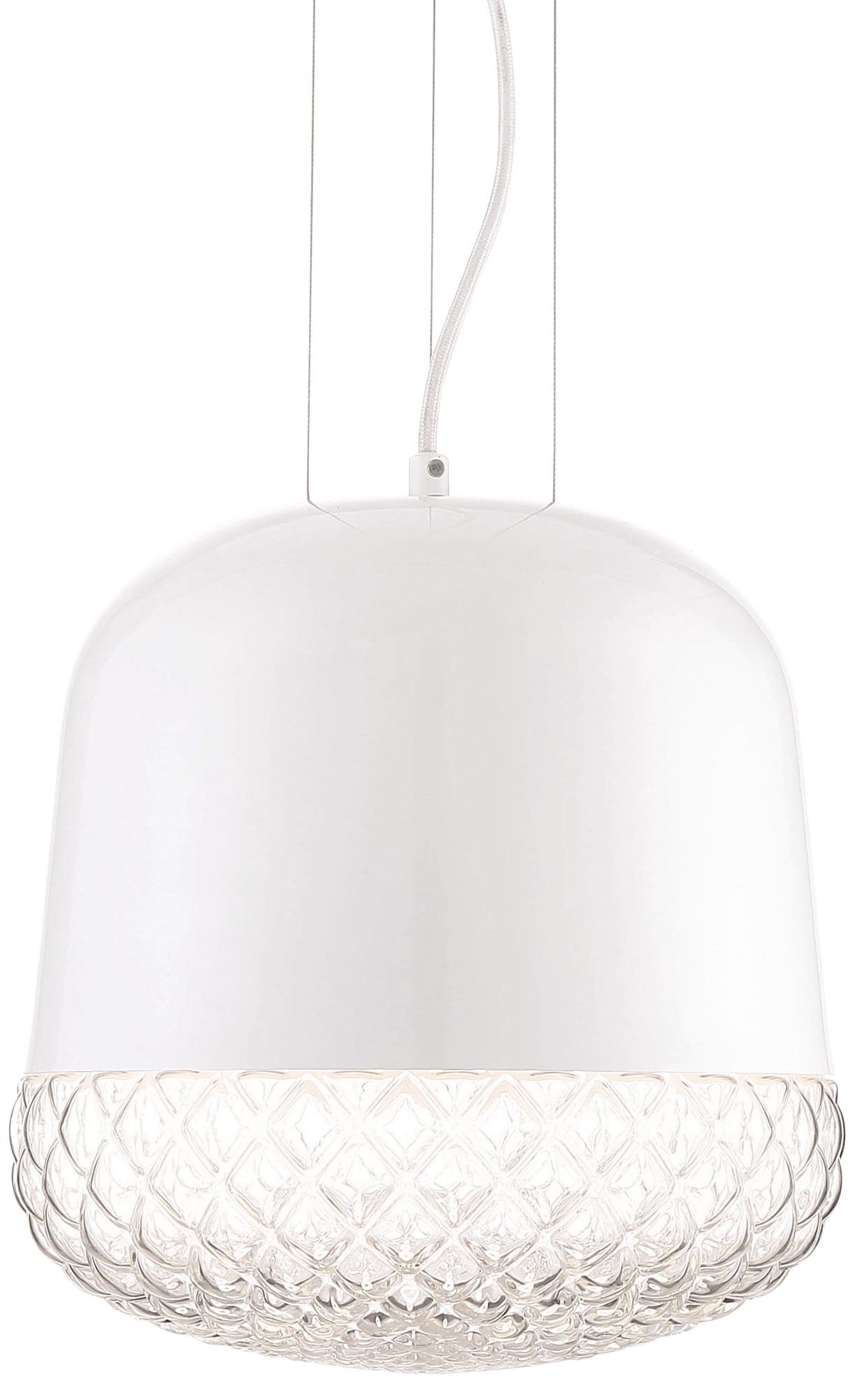 - White finish metal frame. Polished white metal shade with weave glass.